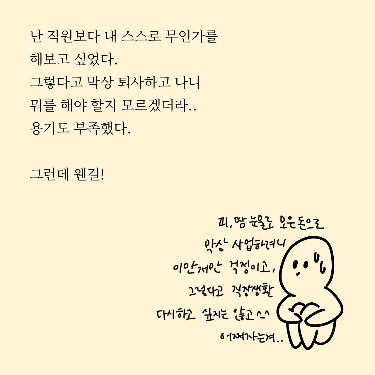 난 직원보다 나 스스로 무언가를 해보고 싶었다. 그렇다고 막상 퇴사하고 나니 뭐를 해야 할지 모르겠더라.. 용기도 부족했다. 그런데 웬걸!