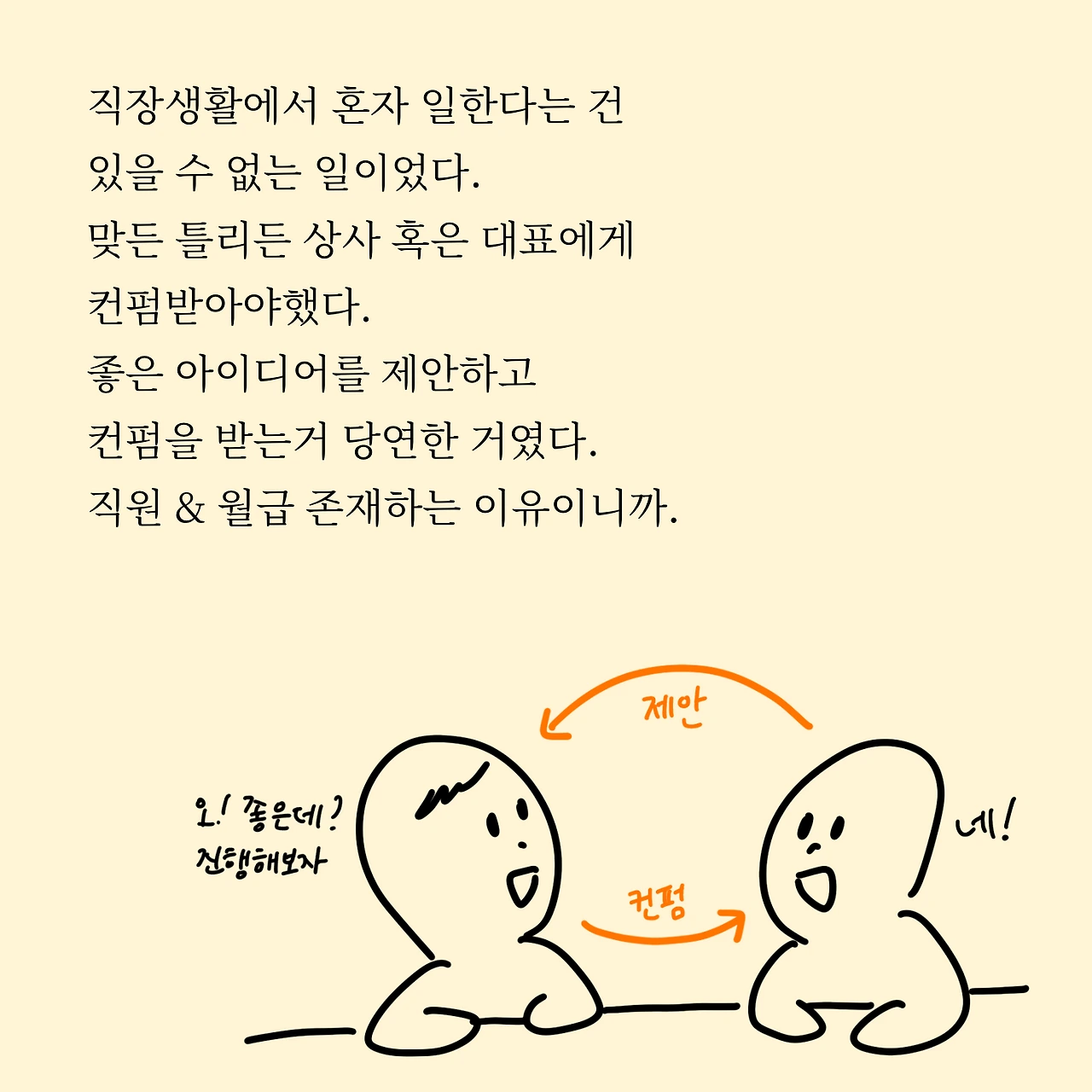 직장생활에서 혼자 일한다는 건 있을 수 없는 일이었다. 맞든 틀리든 상사 혹은 대표에게 컨펌받아야 했다. 좋은 아이디어를 제안하고 컨펌을 받는 거 당연한 거였다. 직원 & 월급 존재하는 이유니까.