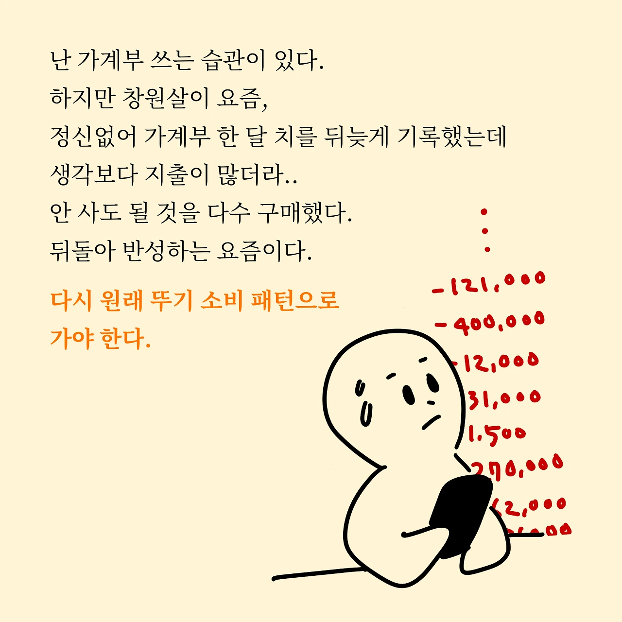 다들 잘하고 계신가요? 저는 소비일기의 힘을 빌려하고 있습니다! 여러분도 스스로 통제하기 어렵다면 소비일기부터 시작해보시는 거 어떨까요? :)