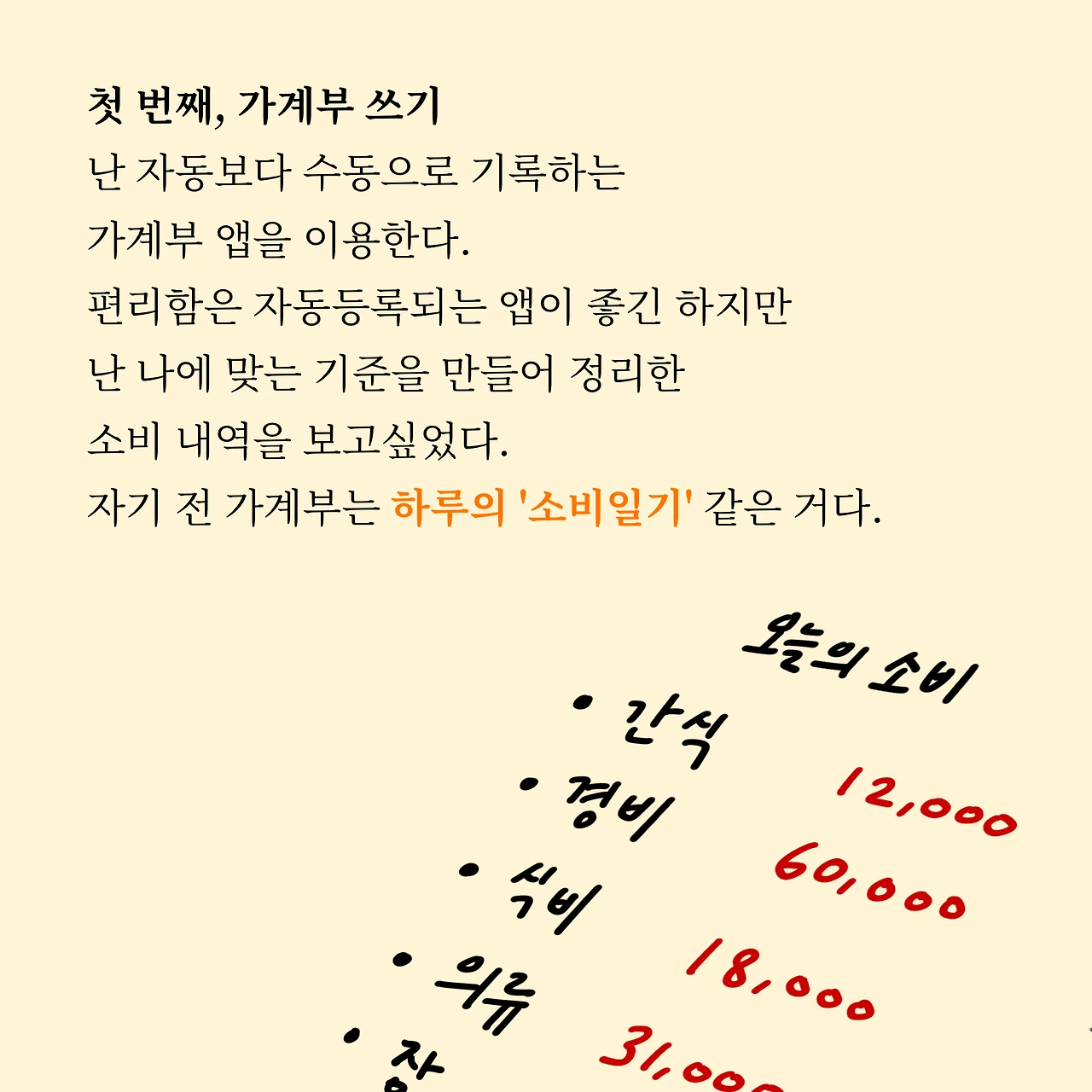 자동보다 수기로 기록하는 가계부를 이용한다. 편리함은 자동 등록되는 앱이 좋긴 하지만 난 나에 맞는 항목들로 정해 가계부를 정리하고 싶었다. 자기 전 가계부는 하루의 '소비일기' 같은 거다.