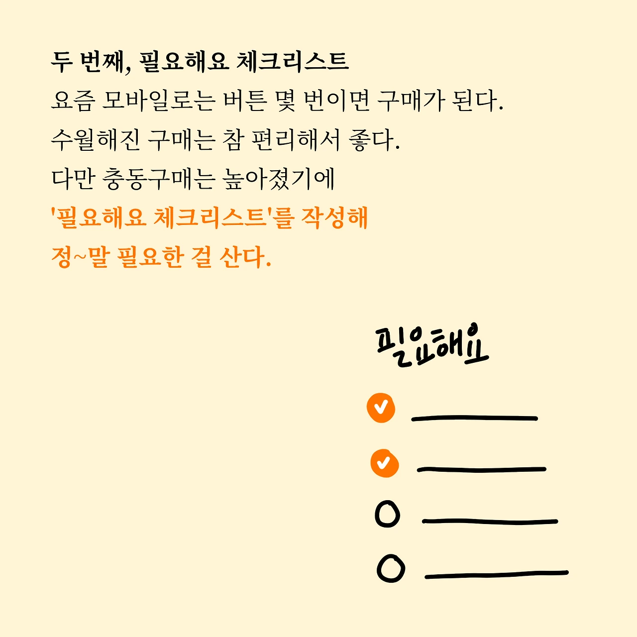 요즘 모바일로는 버튼 몇 번이면 구매가 된다. 수월해지는 구매는 참 편리해서 좋다. 다만 충동구매는 높아졌기에 소비 체크리스트를 작성해 정~말 필요한 걸 사야 한다.