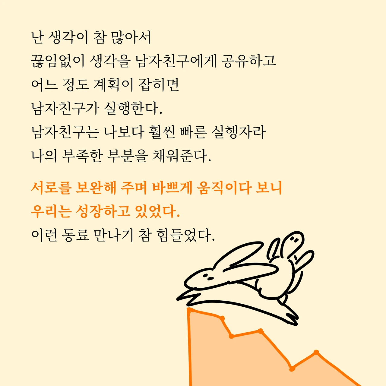 난 생각이 참 많아서 끊임없이 생각을 남자친구에게 공유하고 어느 정도 계획이 잡히면 실행한다. 남자친구는 나보다 훨씬 빠른 실행자라 나의 부족한 부분을 채워준다. 서로를 보완해 주며 바쁘게 움직이다 보니 우리는 성장하고 있었다. 이런 동료 만나기 참 힘들었다.
