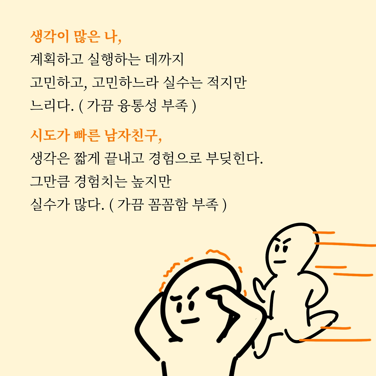 생각이 많은 나, 계획하고 실행하는 데까지 고민하고, 고민하느라 실수는 적지만 느리다. 가끔 융통성 부족하다는 말을 듣기도 한다.