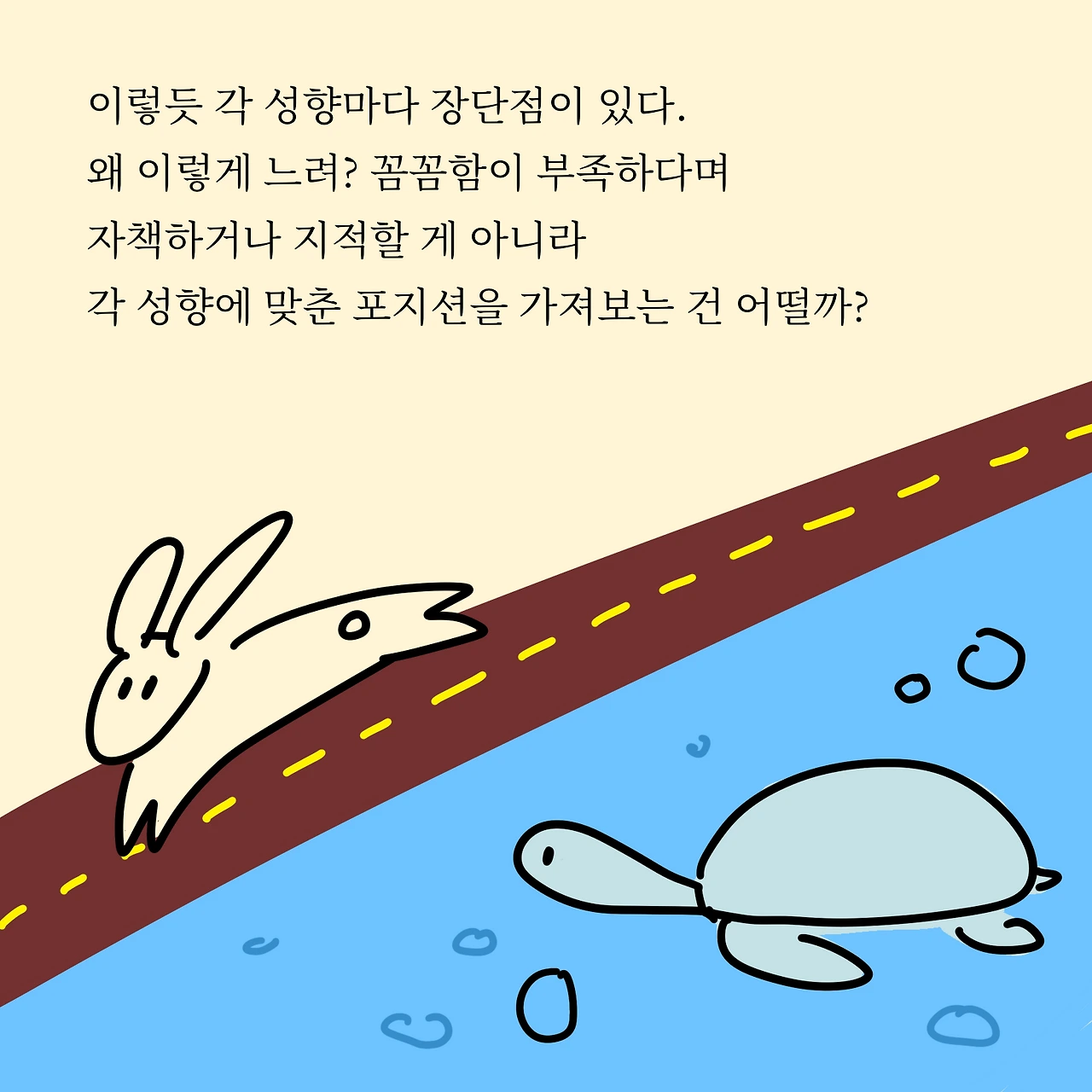 이렇듯 각 성향마다 장단점이 있다. 왜 이렇게 느려? 꼼꼼함이 부족하다며 자책하거나 지적할 게 아니라 각 성향에 맞춘 포지션을 가져보는 건 어떨까?