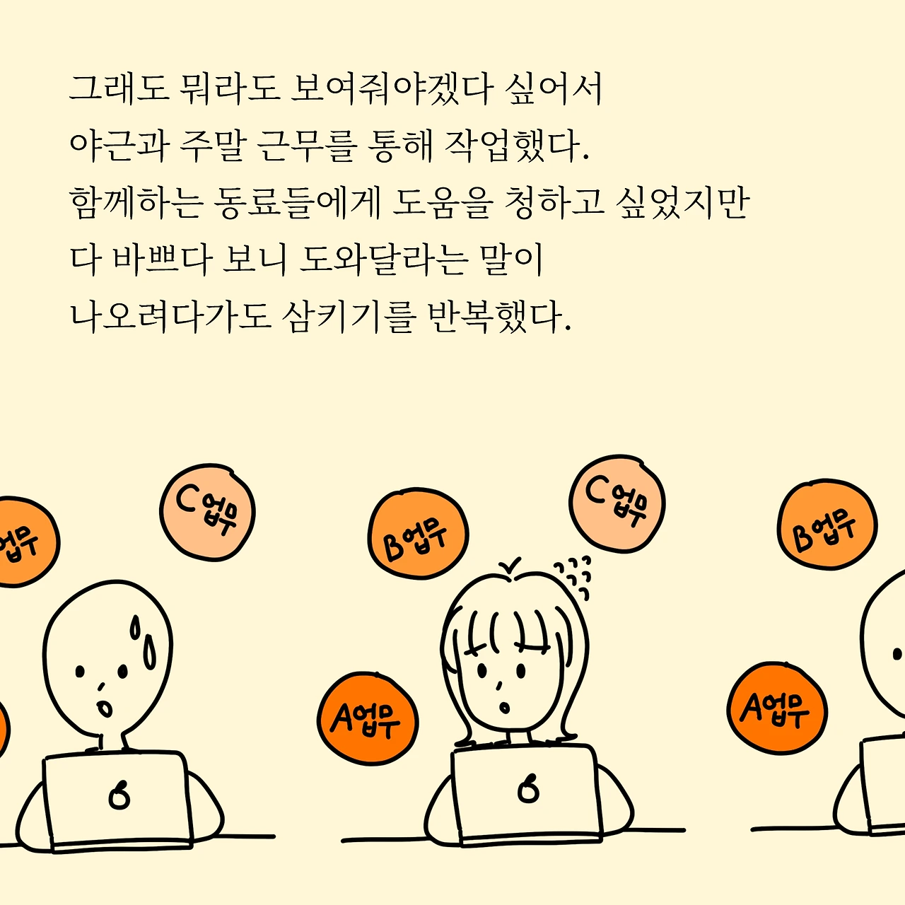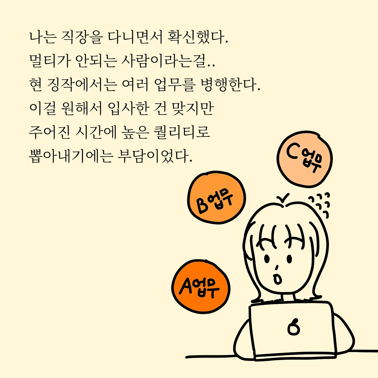 직장을 다니면서 이제는 확신했어요. 저는 멀티, 그니까 병행 업무를 못하는 사람이라는 걸요. 현 직장에서는 여러 업무를 병행해요. 작은 업무부터 무거운 업무까지 다양한데 이걸 주어진 시간 안에 못한다는 게 문제입니다. 이거 했다 저거했다 해보니 집중력이 너무 떨어지고, 전 업무에서 어디까지 했는지도 모르겠고, 어느 순간 뒤죽박죽 되어있고, 결과는 안 나오고 말이죠. 제 그릇은 밥그릇 정도인데 현 회사는 양푼 그릇 정도인 거 같네요. 위태위태합니다..