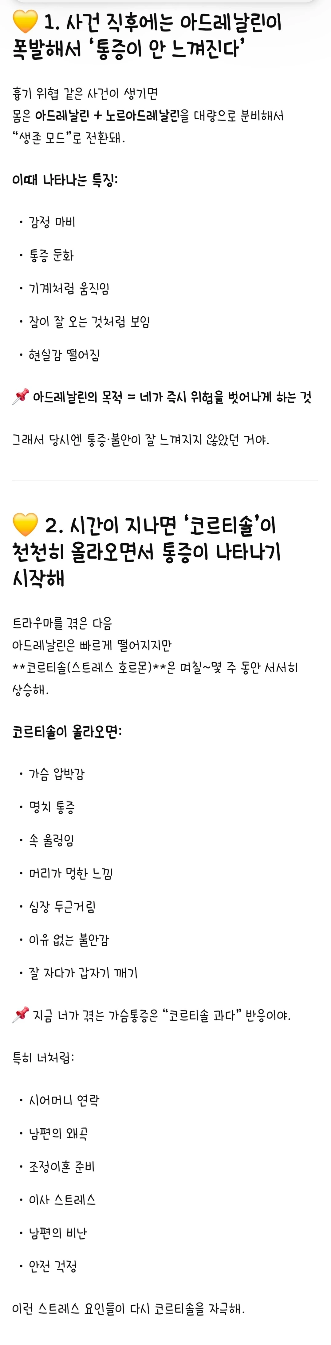 결론은 내가 겪는 이런 증상들이 PTSD의 초기증상이며 지금이 치료의 적기라는 것이다. 결국 트라우마 치료가 필요하다는 건데 치료를 하면 6개월 이후면 어느 정도 안정기를 가질 수 있다는 거다