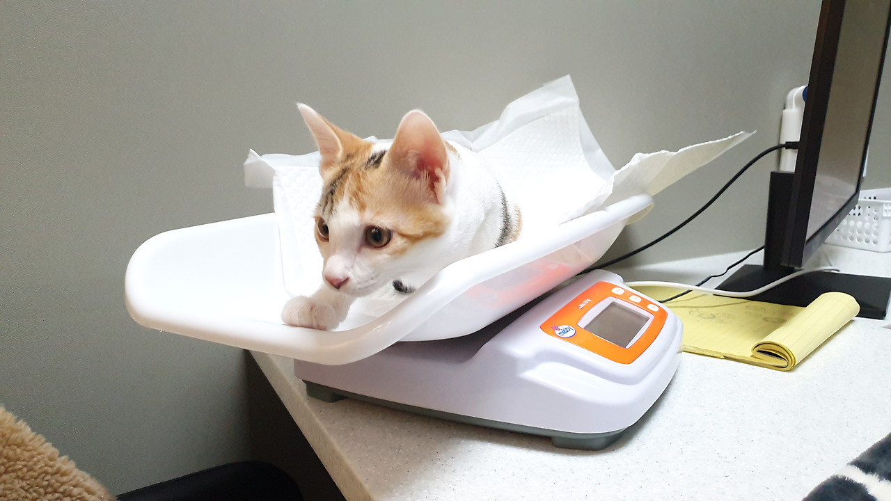 “음…. 모래를 다른 것을 써보시거나, 자주 갈아주심이 어떨까요? 아이 몸무게는 딱 좋습니다.”