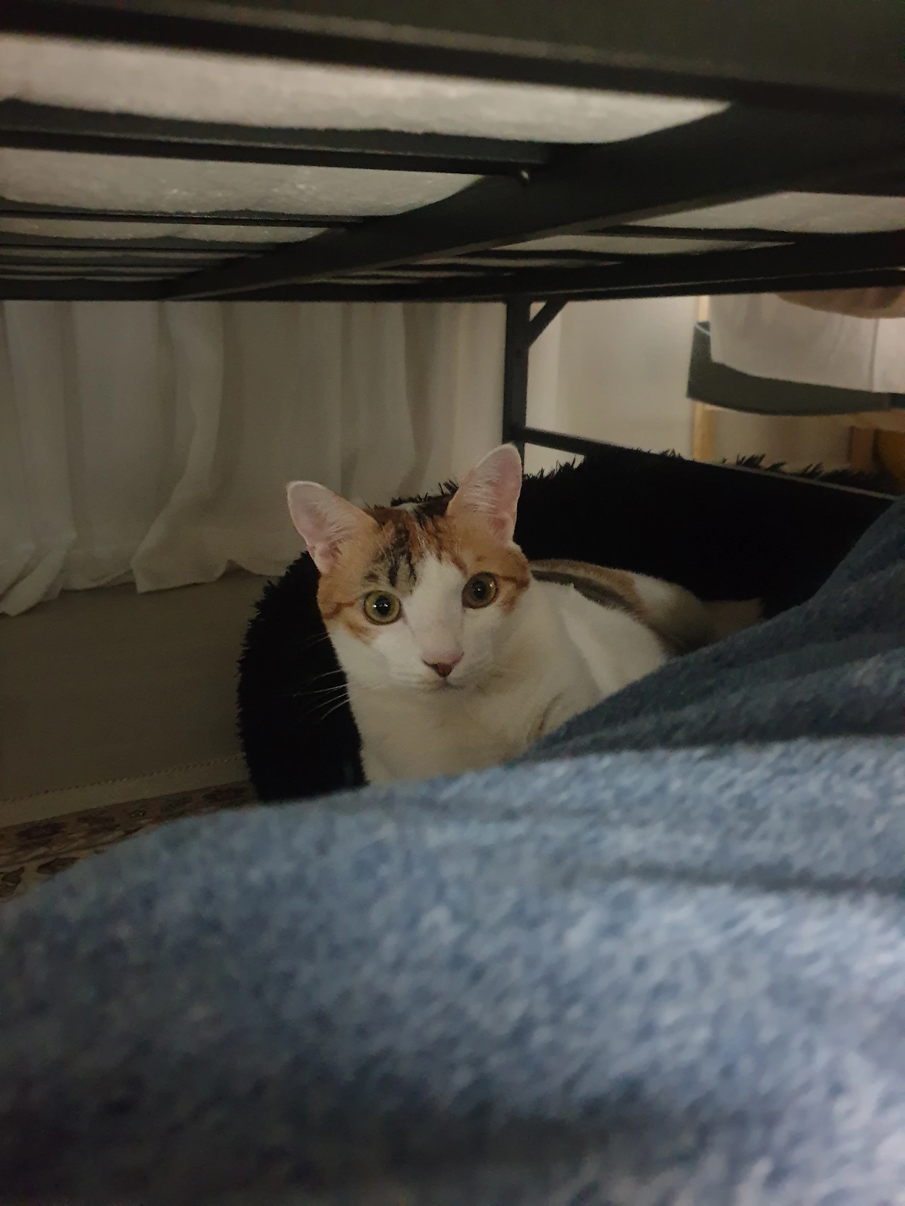 아무 소리도 내지 않고 캣타워를 훌쩍 뛰어 침대로 착지한다.