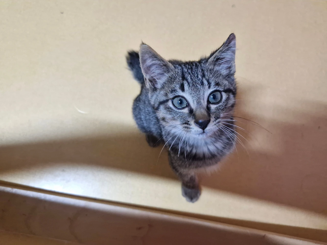 직장동료의 차 본닛에서 발견된 회색과 검은색이 섞인 고등어 무늬 아기 고양이.