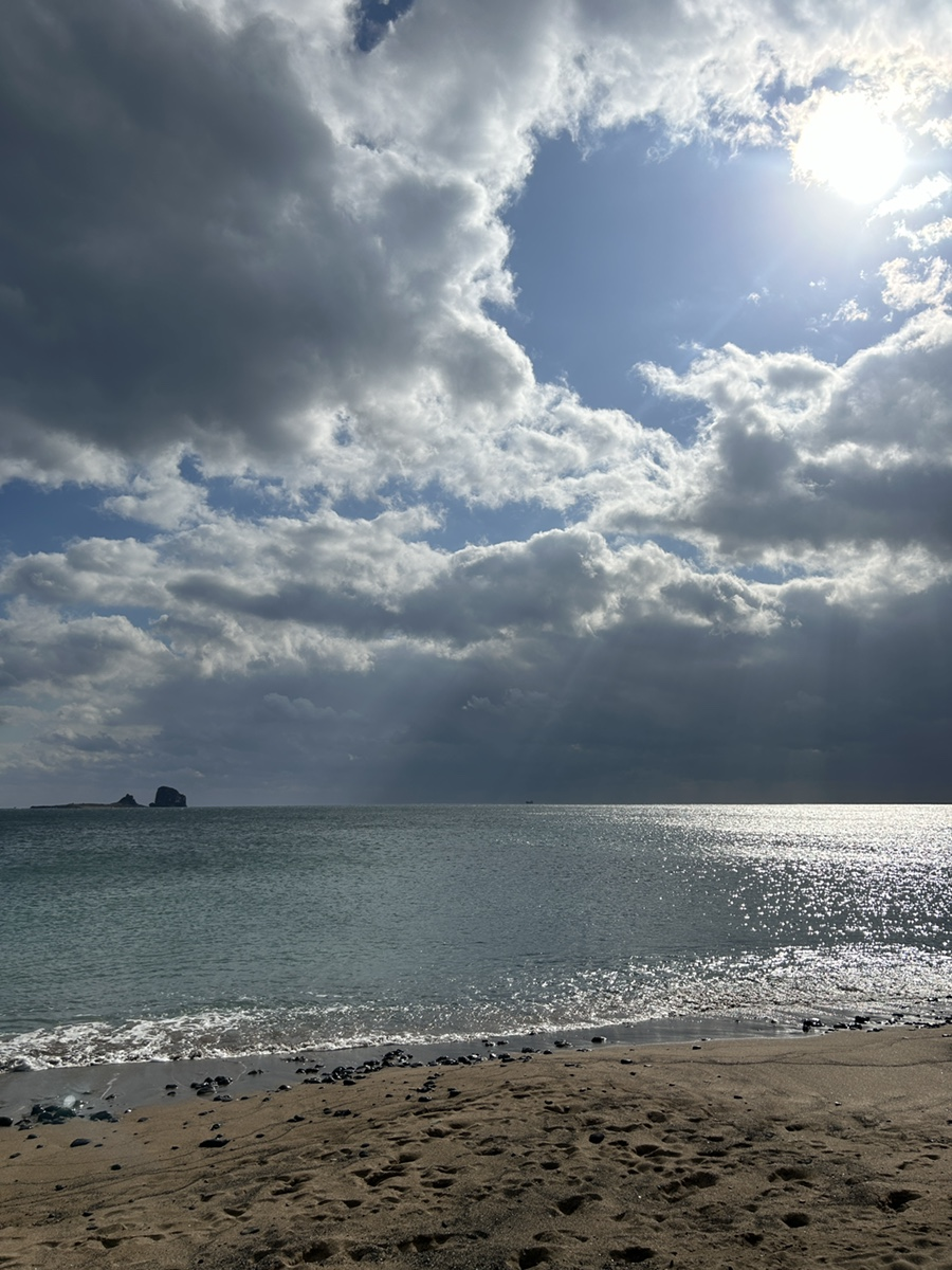 멋진 풍경을 발견하고는 차를 멈춰 세웠다. 최소 천지개벽할 것만 같은 풍경이다. 확실히 애월과 협재의 바닷물보다는 거무죽죽하다. 초당 n만 번 반짝이는 윤슬과 대비되어 더욱 멋졌다.