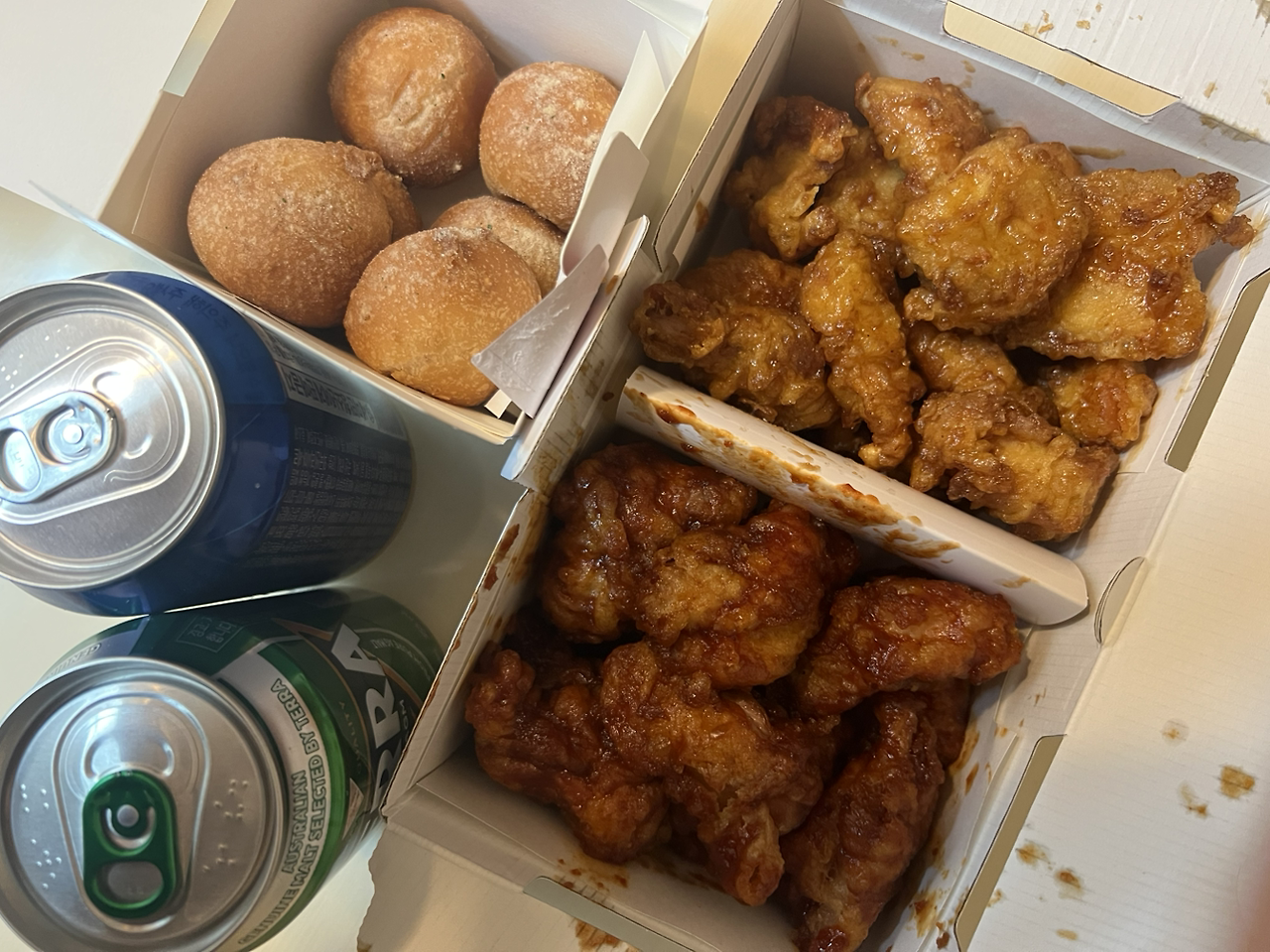 결국 며칠 전 이렇게 남편과 회식을 했네요. 배달 음식은 아이들 재워 놓고 먹어야 더 꿀맛인 거 아시죠? 구독자 여러분 덕분입니다. 짠테크 하는 부부답게 치킨은 쿠폰으로 시켰습니다. 부문장님이 연말에 수고했다는 의미로 저희 부서 팀원들에게 치킨 쿠폰을 보내주셨거든요. 배달비 사천원은 별도라길래 배달비도 아낄 겸 맥주도 사 올 겸 포장해와서 먹었답니다.