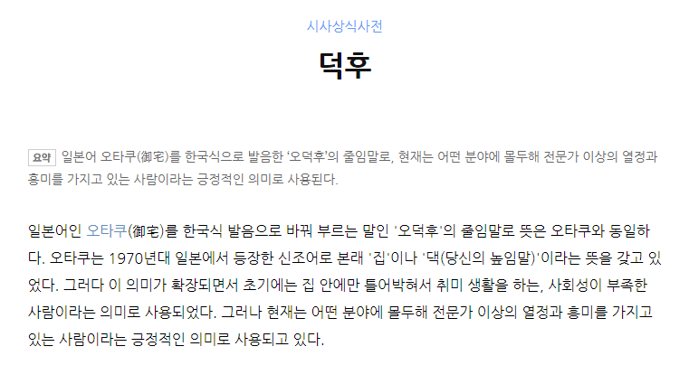 덕후라는 뜻은 현재에서는 '어떤 분야에 몰두해 전문가 이상의 열정과 흥미를 가지고 있는 사람'이라는 의미로 사용되고 있다고 한다.