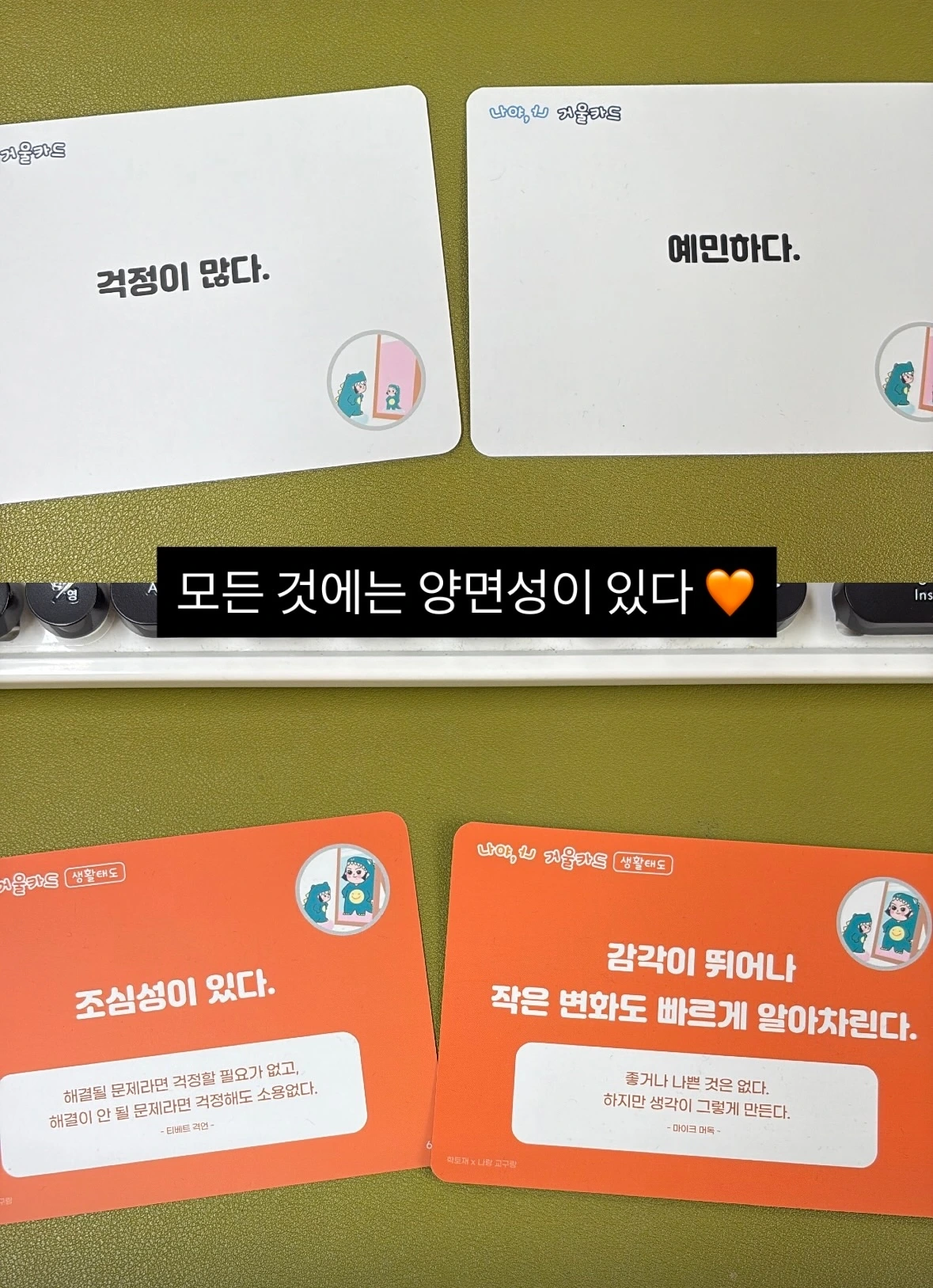 유용한 학습 교구 중 ‘나야, 나 거울카드‘라는 것이 있다. 그 카드의 앞면에는 단점, 뒷면에는 이를 강점으로 바꾼 말이 적혀 있다. 내가 고른 카드는 ‘걱정이 많다’였다. 그렇다, 나는 일어나지 않은 일들을 걱정해서 대비하려는 경향이 있다. 그리고 뒷면을 넘겨보았다. ’조심성이 있다.‘ 아, 생각해보니 나는 걱정들을 양분 삼아 계획을 촘촘히 보완했고 이를 통해 상황을 안전하게 통제했으며 높은 과제수준을 유지할 수 있었다.