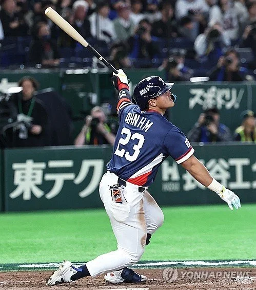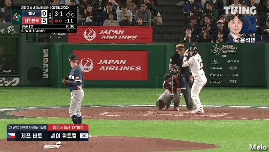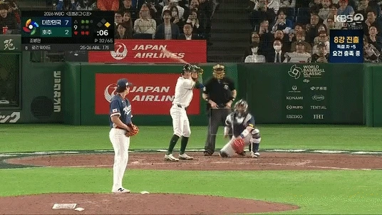 이제 단 하나의 장타만 있으면 확실히 득점하는 대한민국 타선에는 강력한 파워히터인 안현민이 들어서게 된다. 시원한 타격음과 공이 우중간 깊숙히 들어서며 중견수 희생플라이와 동시에 박해민의 홈인으로 스코어7대2, 한국의 8강행 불씨가 다시 타오르게 된다.