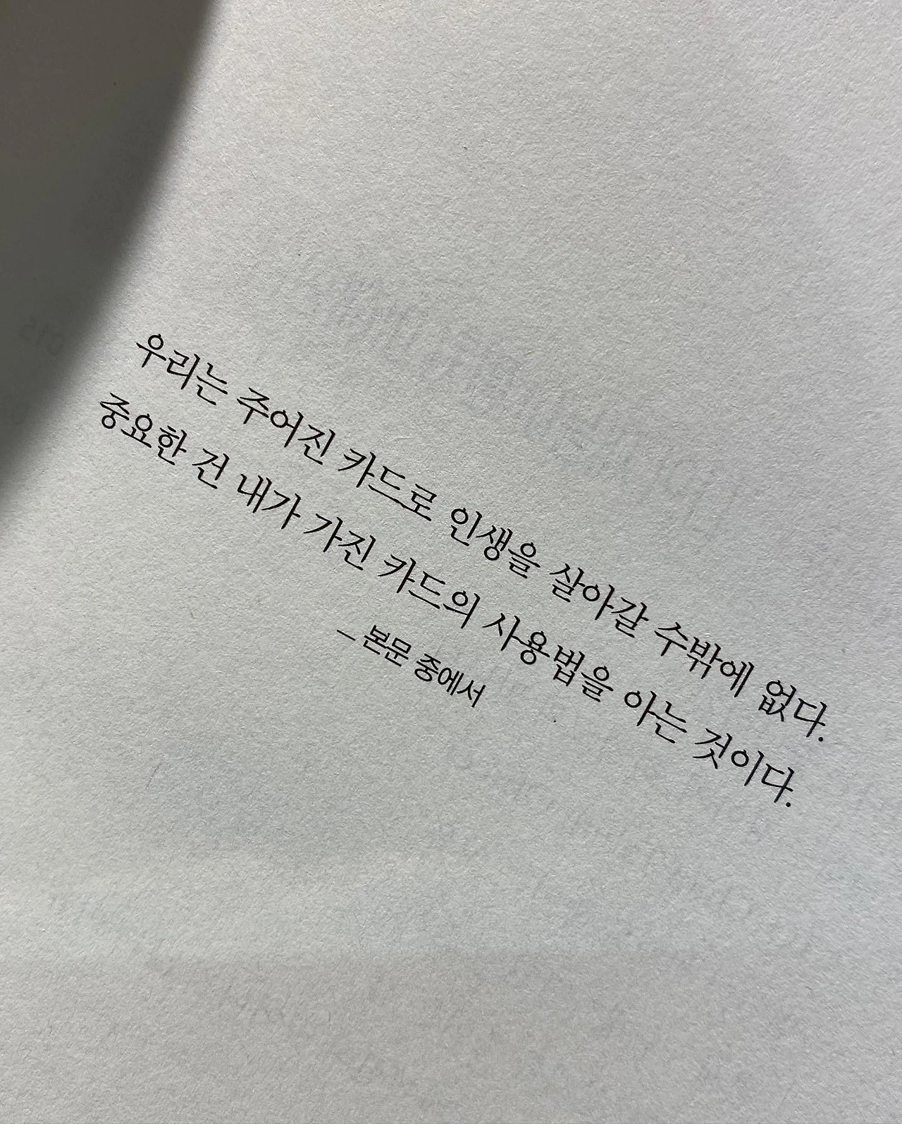 5. 우리는 주어진 카드(재능)로 살아 갈 수밖에 없다. 다른 분야의 재능을 갖는 것은 불가능하다. 하지만 자신의 카드를 계속 내밀었을 때 최고의 나를 만날 수 있다.