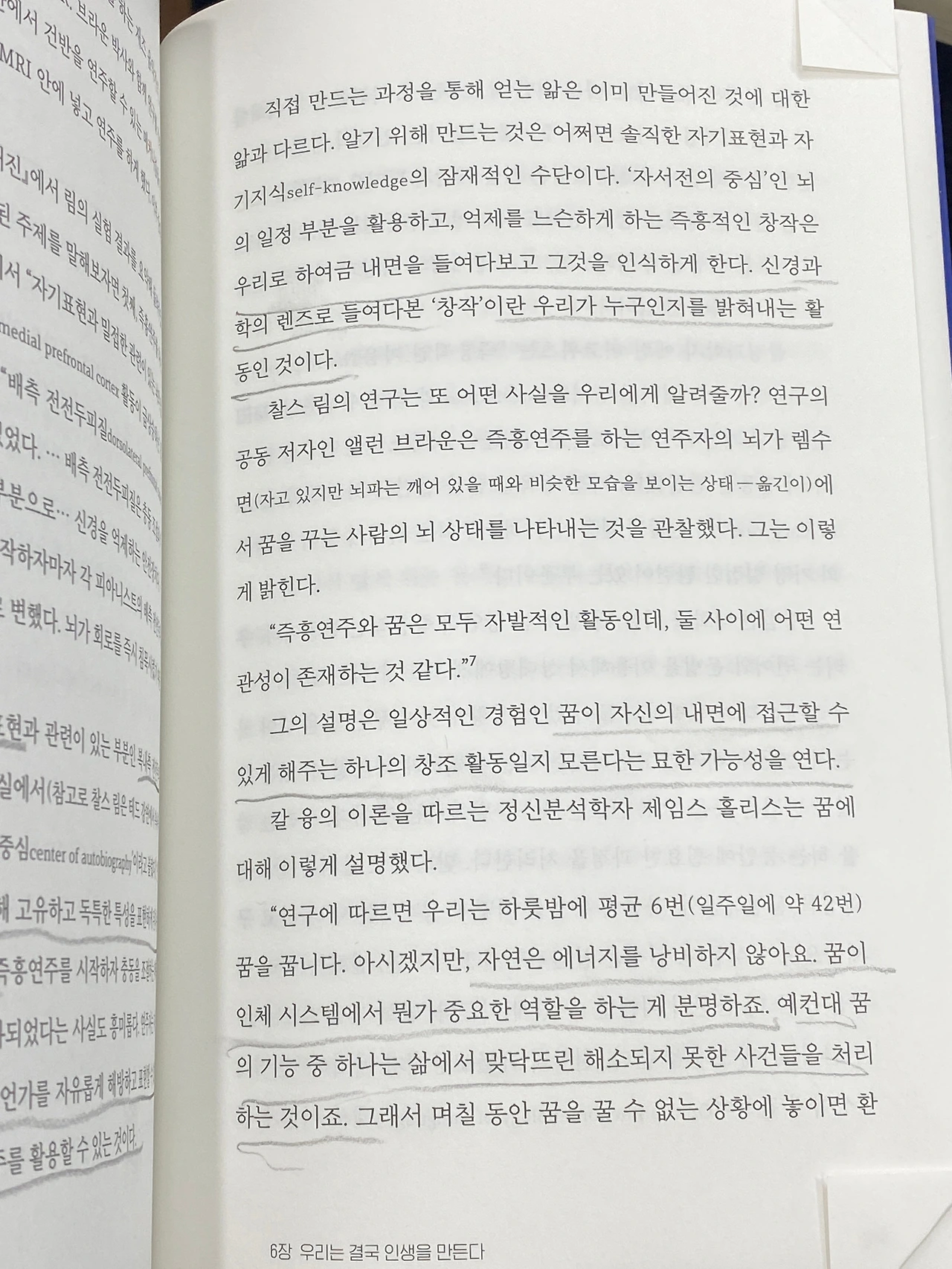 연구에 따르면 우리는 하룻밤에 평균 6번 꿈을 꿉니다. 자연은 에너지를 낭비하지 않아요. 꿈이 인체 시스템에서 뭔가 중요한 역할을 하는 게 분명하죠. 예컨데 꿈의 기능 중 하나는 삶에서 맞닥뜨린 해소되지 못한 사건들을 처리하는 것이죠.