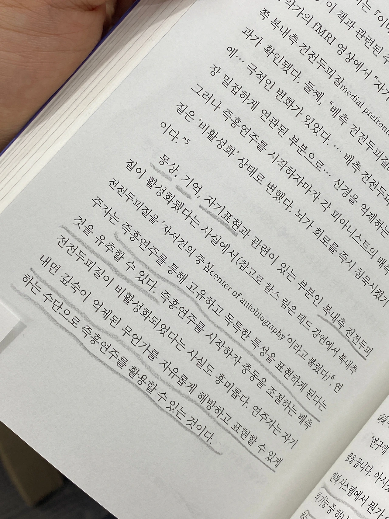즉흥 연주를 하는 음악가의 fMRI 영상에서 "자기표현과 밀접한 관련이 있는 뇌의 앞쪽 복내측 전전두피질 활동이 급상승하는" 결과가 확인됐다. 둘쨰, "배측 전전두피질이 '비활성화'상태로 변했다. 배측 전전두피질은 충동 조절과 가장 밀접하게 연관된 부분으로, 신경을 억제하는 안전장치다.