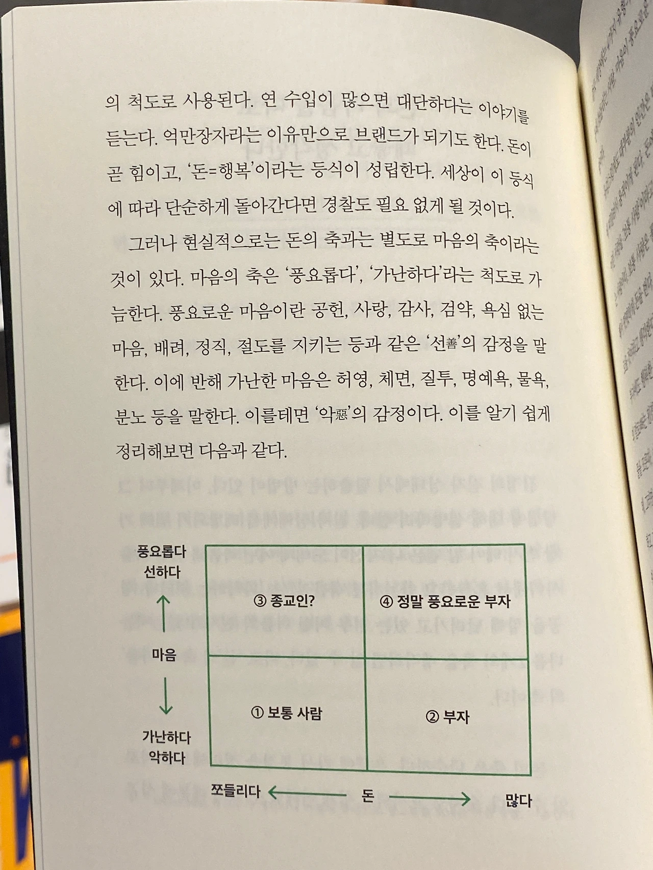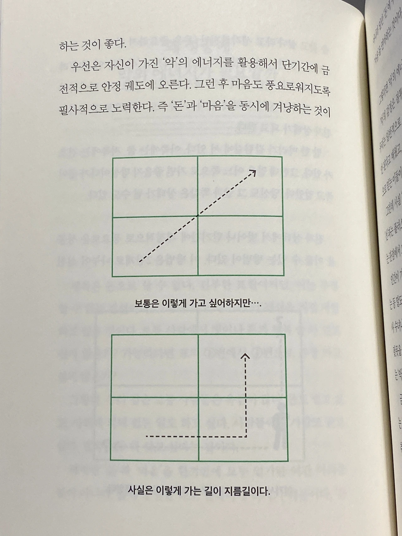 1. 먼저 ‘악’의 에너지를 활용해서 금전적으로 궤도에 오른다. 이후에 마음도 풍요로워지도록 노력한다. 즉 돈과 마음을 동시에 겨냥하는 것이 아니라 일단 ‘돈’에 우선순위를 두고 이후에 필사적으로 ‘마음’을 연마한다. 악의 감정은 질투, 적대심, 체면, 허영심 등이다.