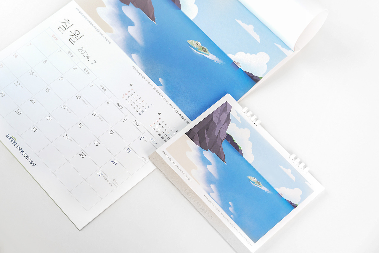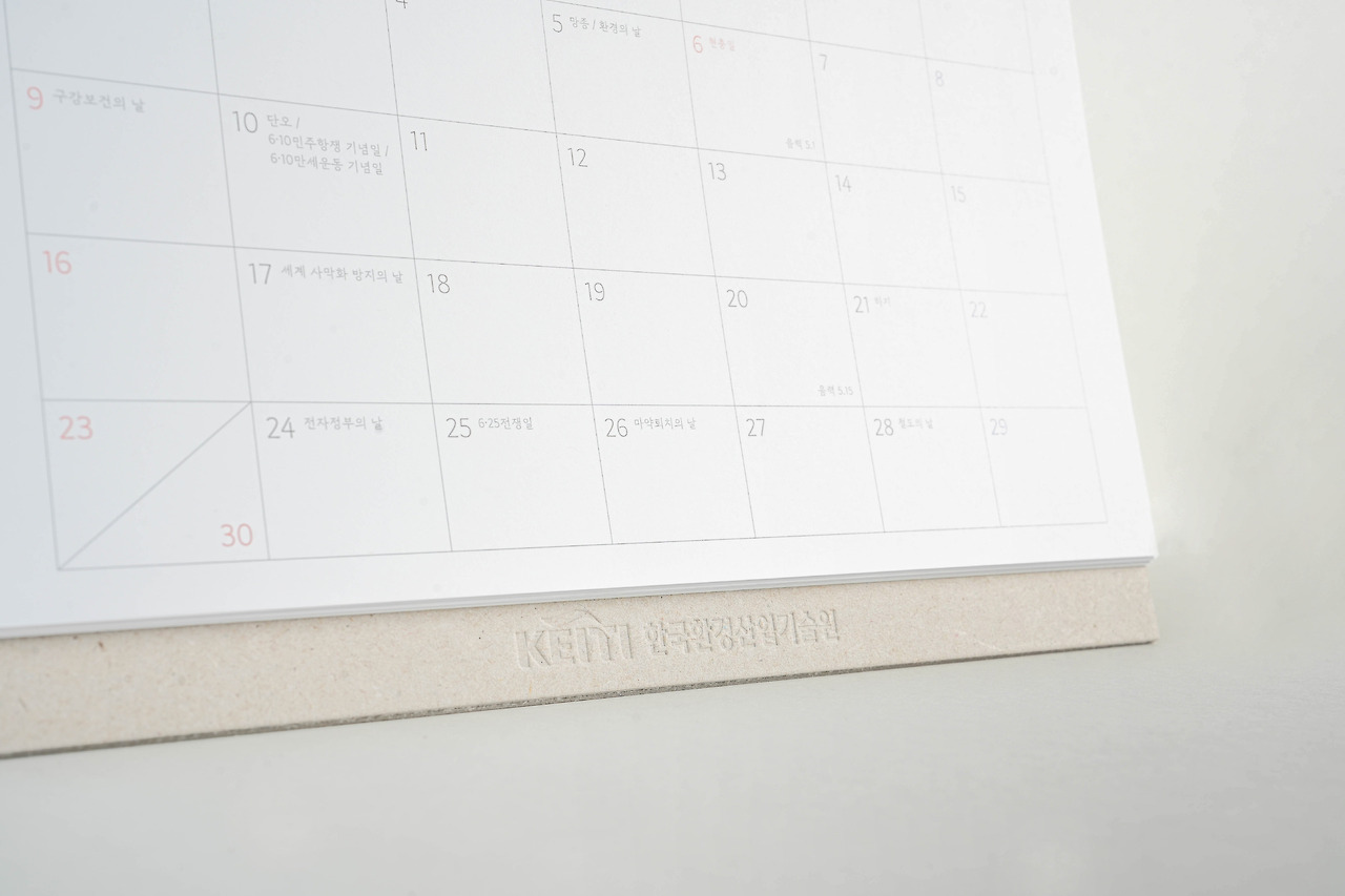 한국환경산업기술원은 친환경 인증 종이를 사용하고, 지류 삼각대와 종이 링 제본을 활용하여 기존의 사용 편리성을 유지하면서 별도의 분리 작업 없이 재활용 및 폐기가 가능한 달력을 제작했습니다.