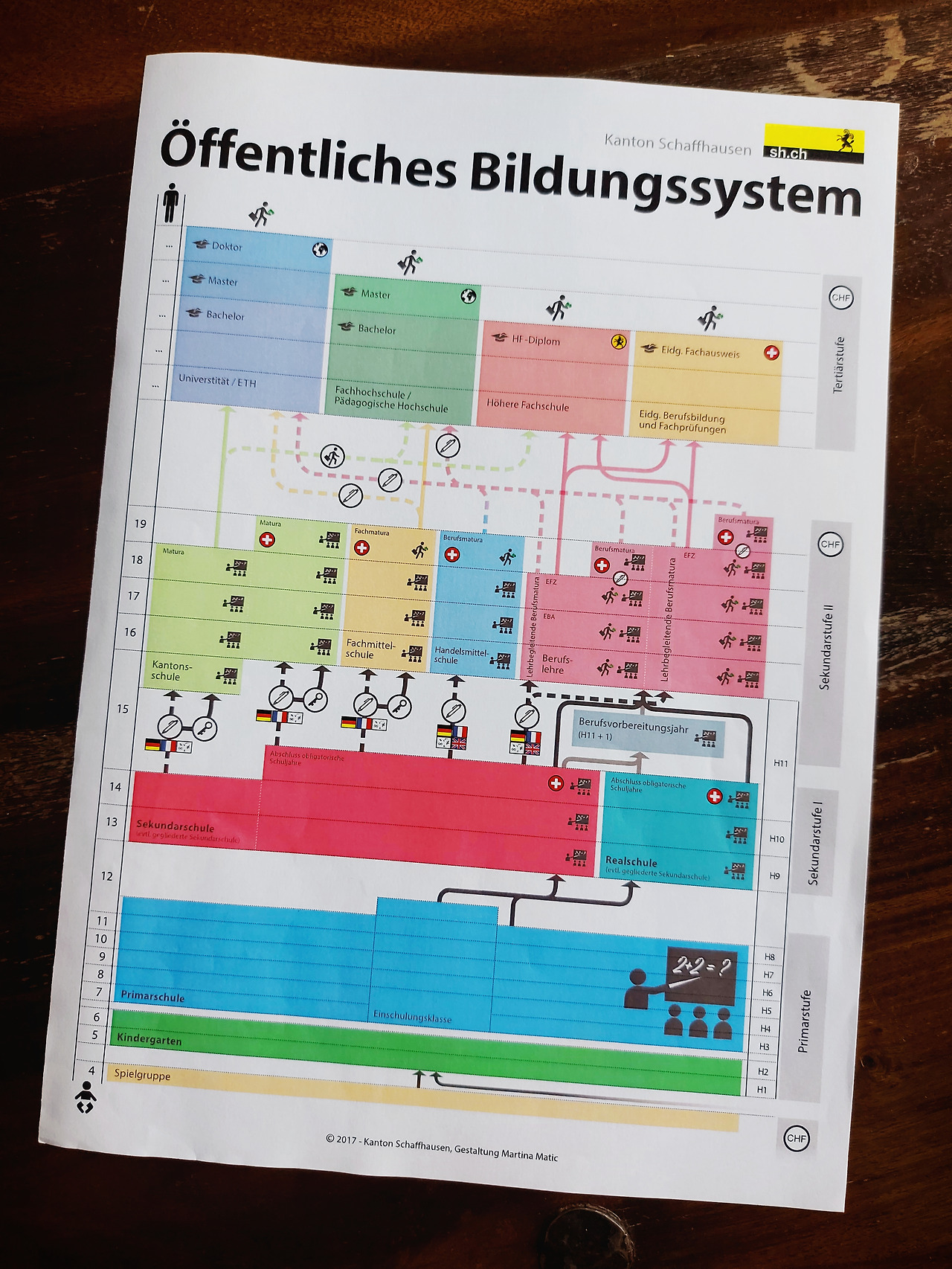아이 입학식에서 나눠준 스위스 교육 시스템 표. 표 왼쪽 나이에서 15세 이상 부분부터가 고등교육이다. 고등교육 이후의 진로는 간식 사다리 타기처럼 자유롭게 선택 가능하다.