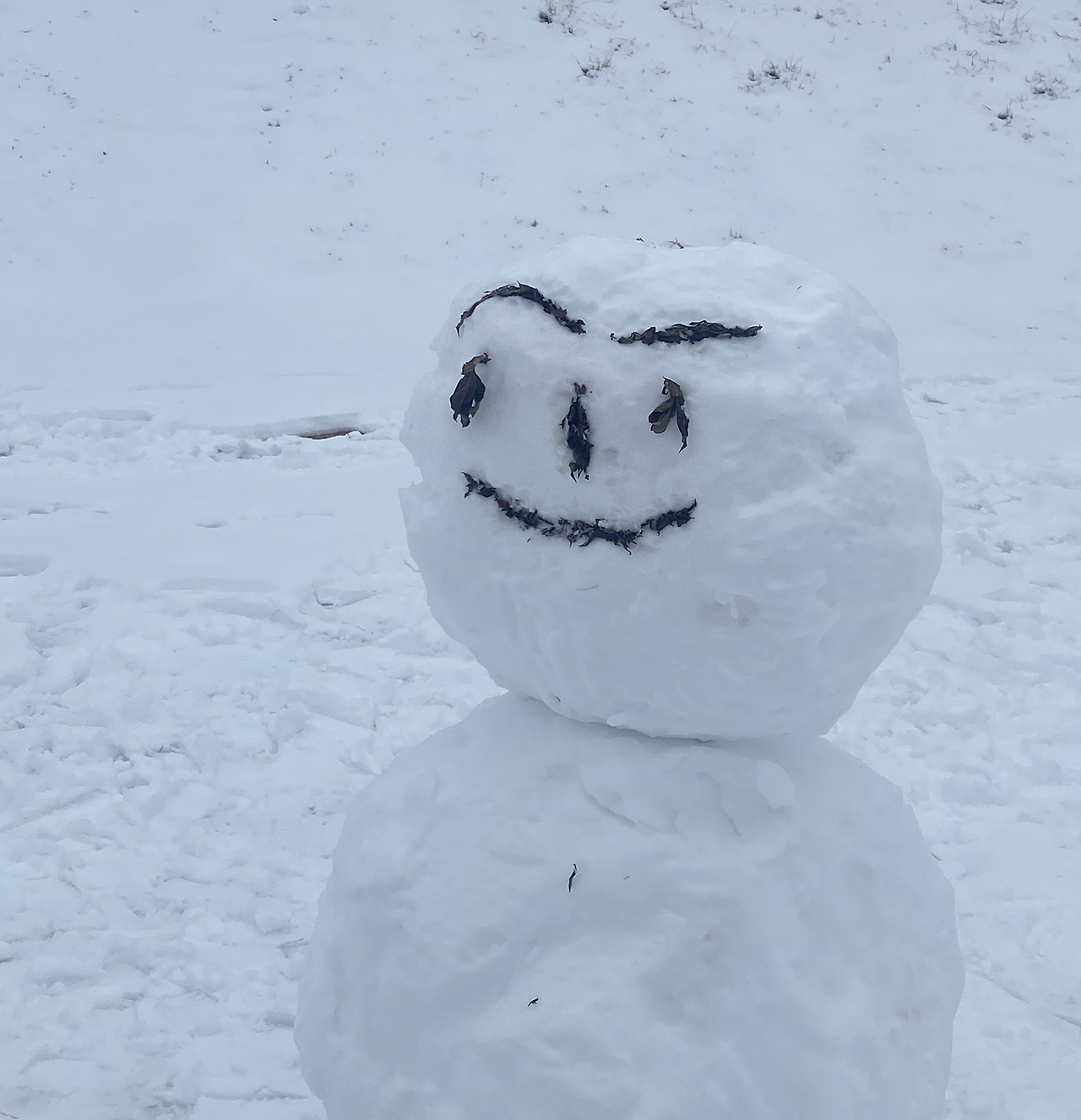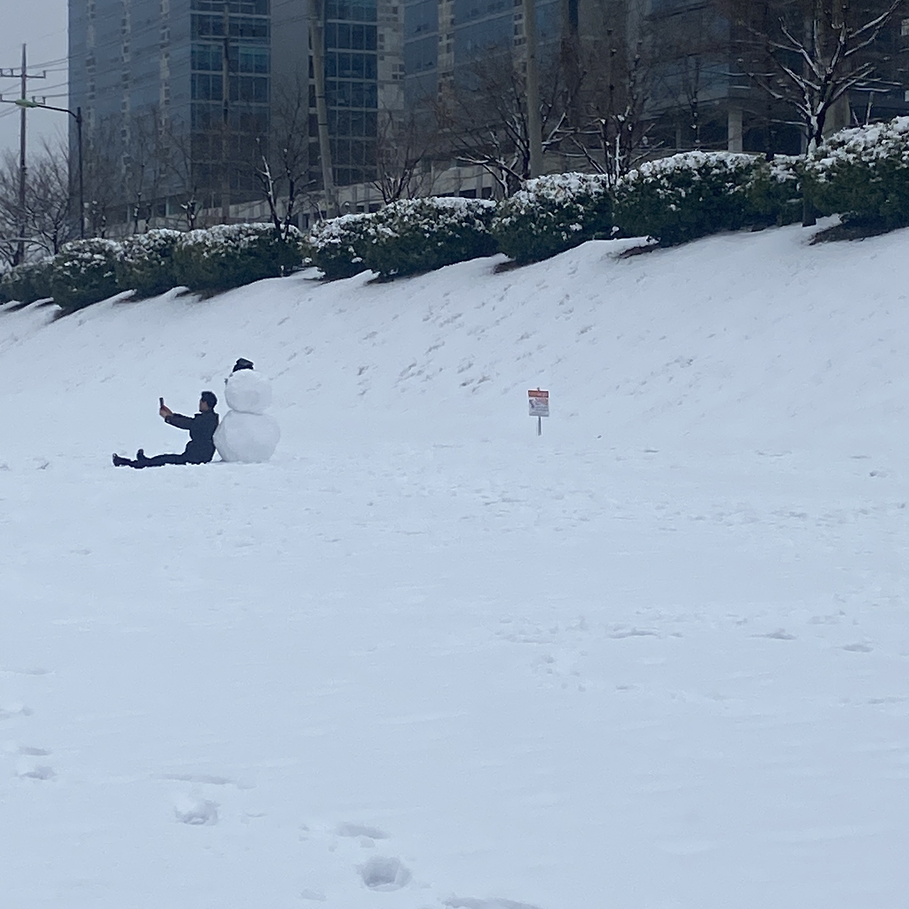 하천을 장식한 눈 덕분에 지겨울 뻔했던 마음이 사그라지며 나는 넘어지지 않는 선에서 다시 빠르게 걸었다. 그러다 멀리 중년의 남성이 눈에 띄었다. 그는 눈밭에서 다리를 V자 형태를 하고 앉아 셀카를 찍고 있었는데 그 뒤로 커다란 눈사람이 있었다.