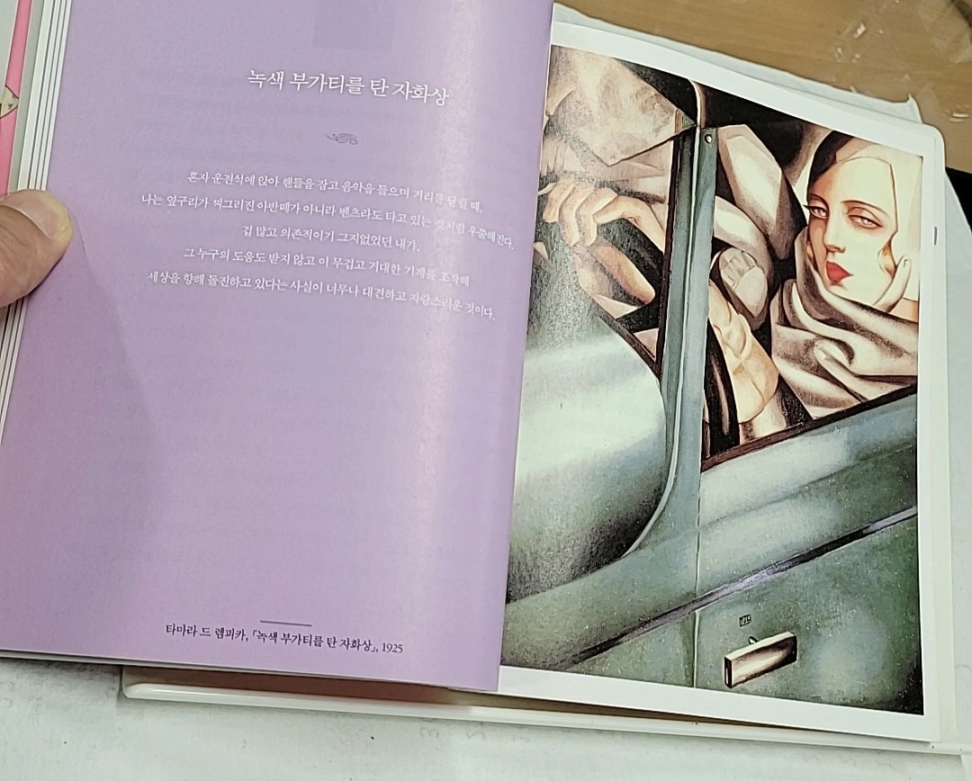 자꾸 생각이 나서 도저히 가만있을 수 없었다. 결국 ‘타마라 드 렘피카'의 「녹색 부가티를 탄 자화상(일명 ‘녹색 부가티를 탄 타마라’)」을 구입했다. 작품을 내 손으로 받기까지 하루에도 몇 번씩 초조하게 배송 조회를 확인했다. 그리고 그 작품은 꽤 오랜 기간 동안 사무실 책상 벽에 걸려 있었다.