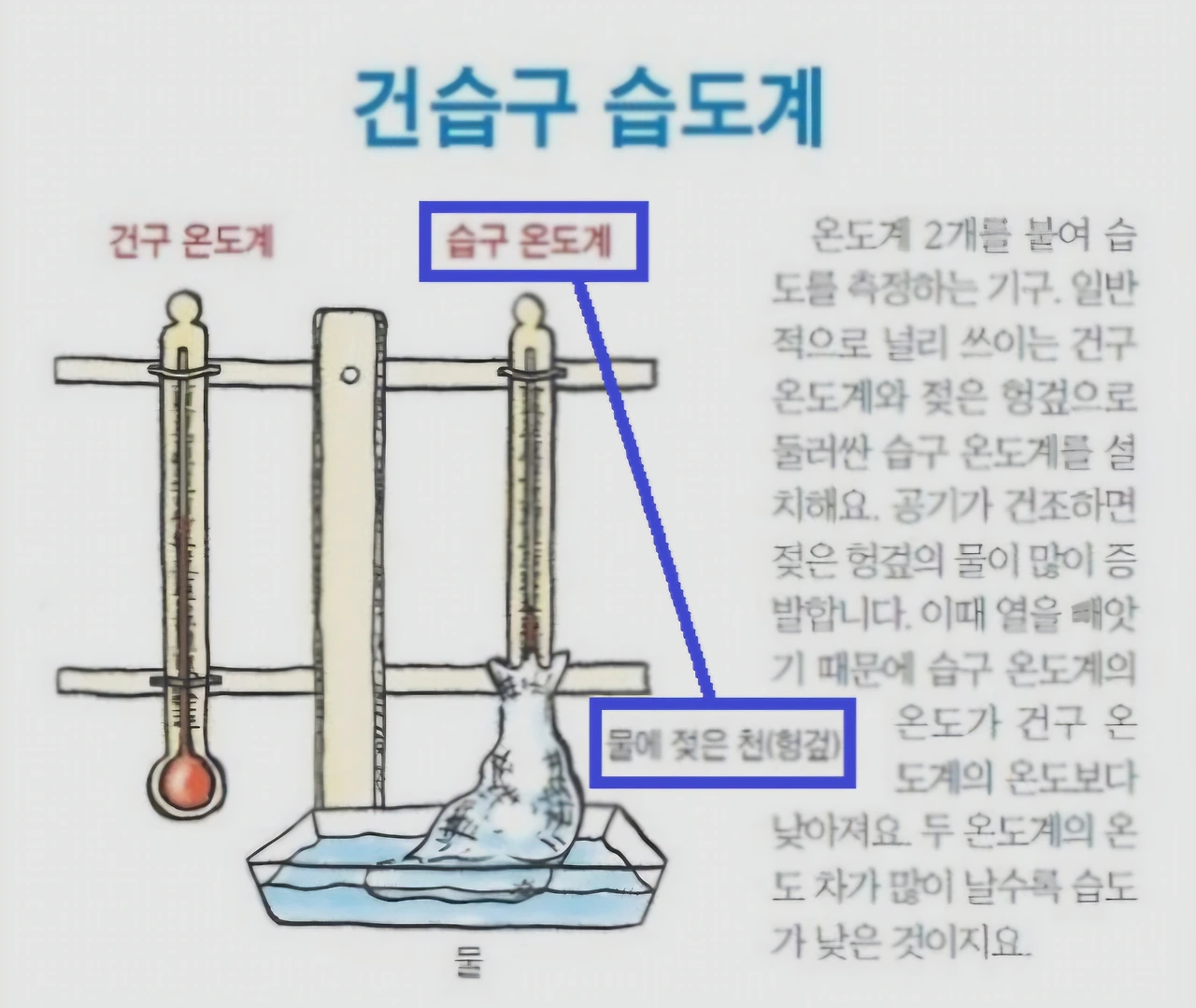 "아빠, 나 오늘 과학시간에 과학 선생님한테서 혼났어. 지난 시간에 배운 건습구습도계에 대해서 질문을 받았는데 내가 틀리게 답했어."