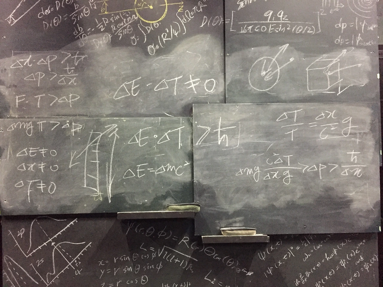 그래서 나는 학교에 다니기를 잠깐 멈추고, 이 극단에 뛰어들었다. 무작정 이메일을 보낸 나를 극단 사람들은 너그럽게 받아주었다. 내가 관객으로 봤던 양자역학 연극은 더 많은 배우와 함께, 이전보다 정돈된 대본으로 대학로에서 재공연을 올리게 되었다. 그리고 나는 연습 과정을 지켜보면서, 이 사고실험과 수식들이 어떻게 연극의 일부가 되었는지 알게 되었다. 극단의 기획을 맡고 계신 분은 물리교육과 박사 과정을 밟고 계신 연구자이자, 같은 학교의 선배이자, 나의 직속상관이었다. 바로 이분이 수식을 정리해서 배우들에게 유도 과정과 식들의 의미를 알려주신 거였다.