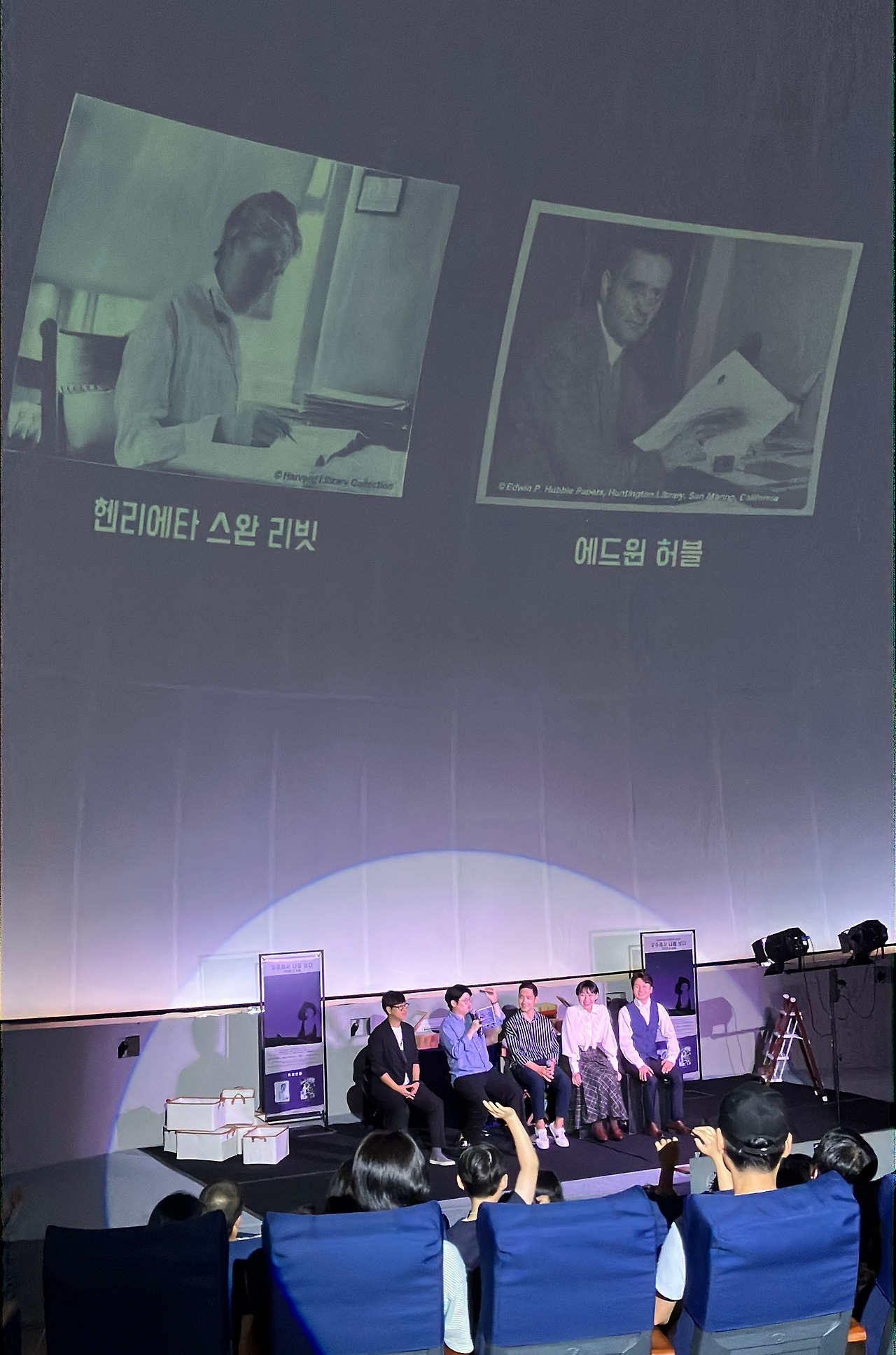 곧이어 교수님은 리비트는 누구고 허블은 누구인지, 변광성이 무엇인지, 그게 어떻게 은하 간의 거리를 측정하는 데 도움이 되는지 등을 열심히 설명하기 시작하셨는데, 나는 그 순간 강의실에 앉아있는 듯한 느낌에 사로잡혔다. 학교에서 강의를 듣다 보면, 도저히 더는 앉아있을 수 없겠다 싶은 순간이 종종 찾아온다. 일종의 임계점이다. 그럴 때면 이건 문화센터 강의고 나는 지금 교양을 쌓으러 온 시민이다, 하는 최면을 걸곤 한다. 강의실에서는 그게 먹혀서 좀 더 참고 앉아있을 수가 있는데, 정작 진짜 문화센터 같은 상황이 되니까 제자리에 앉아있어야만 한다는 사실이 그렇게 괴로울 수가 없었다. 상황은 극단 기획님이 나와서 관객들의 질문을 받고, 교수님이 대답을 해 주시면서 더욱 악화되었다. 빼곡히 앉아있는 어린 친구들의 질문을 모두 받고, 그에 대한 교수님의 답변을 다 들으려면 우리 극단과 교수님 모두 향후 10년간 이 사업에만 집중해야 할 판이었다. 일할 때는 단순히 아, 퇴근하고 싶어서 그런가 보다, 했는데…… 우리 극단 관객과의 대화는 관객으로 들어도 긴 게 맞았다.