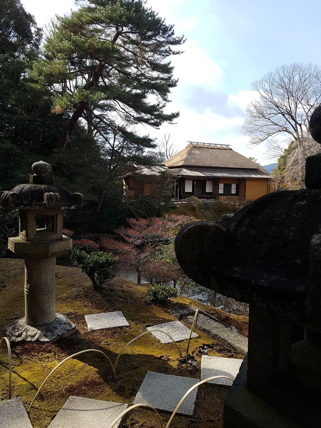 이런 스키야즈쿠리는 흔히 ‘아름다운 사비(さび, 寂)’라고 불립니다. 와비사비(わびさび)는 일본의 미적 관념 중 하나로 불완전함에서 완전함을 찾고 추함에서 아름다움을 찾는 것으로 가공된 아름다움보다는 자연에 가까운 불완전함이 본질에 가깝고 그곳에서 아름다움을 찾을 수 있다는 뜻을 내포하고 있습니다. 요즘은 와비(わび, 侘)와 사비의 뜻을 구분하지 않고 와비사비라고 합쳐서 부르지만, 와비와 사비의 뜻은 정확히는 같은 뜻이 아닙니다. 와비와 사비에 대한 자세한 이야기는 이후 다이토쿠지(大德寺)에서 하도록 하고 사비의 뜻만 단어로 말해보자면 누추함, 쓸쓸함, 메마름 정도가 되겠습니다. 즉, 화려함과는 거리가 먼 어느 산골에 지푸라기와 나무를 모아 간신히 세운 좁은 초막과 같은 느낌입니다. 센노 리큐가 추구했던 사비는 이러한 느낌이었지만, 고보리 엔슈는 이를 대중적으로 발전시켜 조금 더 밝고 세련되며, 큰 형식을 제시했습니다. 센노 리큐의 양식보다는 화려해졌지만, 고보리 엔슈의 건축과 정원에서도 여전히 사비의 느낌을 받을 수 있었습니다. 그래서 고보리 엔슈의 스키야즈쿠리를 두고 아름다운 사비라고 하는 것입니다.