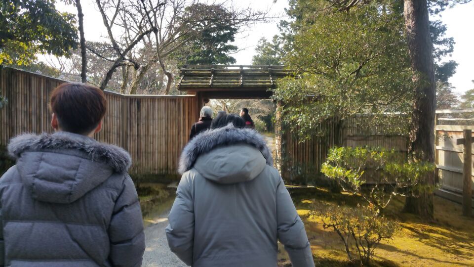 트렁크를 들고 뛰고 걷고 하다 보니 숨이 차오르는 것은 물론이거니와 한겨울인데도 땀이 뻘뻘 났습니다. 계속 뛰어가던 중에 길 너머로 인공 대나무를 엮어 만든 대나무 울타리인 호가키(穗垣)가 홀연히 나타나 가쓰라리큐에 거의 다 왔음을 알려주었습니다. 울타리를 돌아 참관자 휴게실에 도착하여 접수를 하고나서야 거친 숨을 고를 수 있었습니다. 숨을 다 고르고 나서 주변을 둘러보는데 가쓰리리큐를 해설하는 동영상이 나오고 있었습니다. 해설의 내용은 기억에 없고 동영상이 돌아가면서 나오는 가쓰라리큐의 사계가 무척 아름다웠다는 기억만 남아 있습니다.