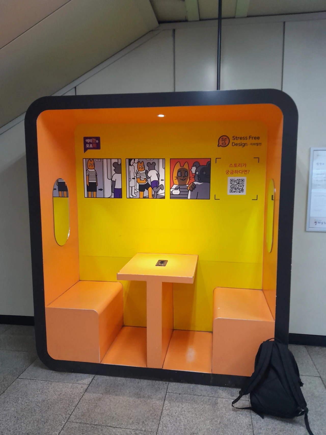 5호선을 타고 동대문역사문화공원역을 방문했습니다. 긴 환승통로를 따라 2호선 승강장으로 갔습니다. 외선순환행 승강장으로 들어서니 바로 옆에 4호선 환승통로가 있었습니다. 수유역에 살 때 그 환승통로를 따라 등교했던 것을 기억하며 한 번 웃어주고는 앉을 곳을 찾았습니다. 4호선과 5호선의 환승통로가 가까운 쪽에는 앉을 곳이 없어 천천히 승강장을 걸어 반대쪽으로 갔습니다. 승강장의 반대 끝 쯤 도착하자 ‘Stress Free Design’이라고 적힌 특이한 의자가 있었습니다. 그리고 그 의자에는 책상도 달려 있었습니다. 여행하는 중에 처음으로 책상을 쓸 수 있는 순간이 왔습니다. 재빨리 저는 의자에 앉았고 편안함을 만끽했습니다. 동역사 만세.
