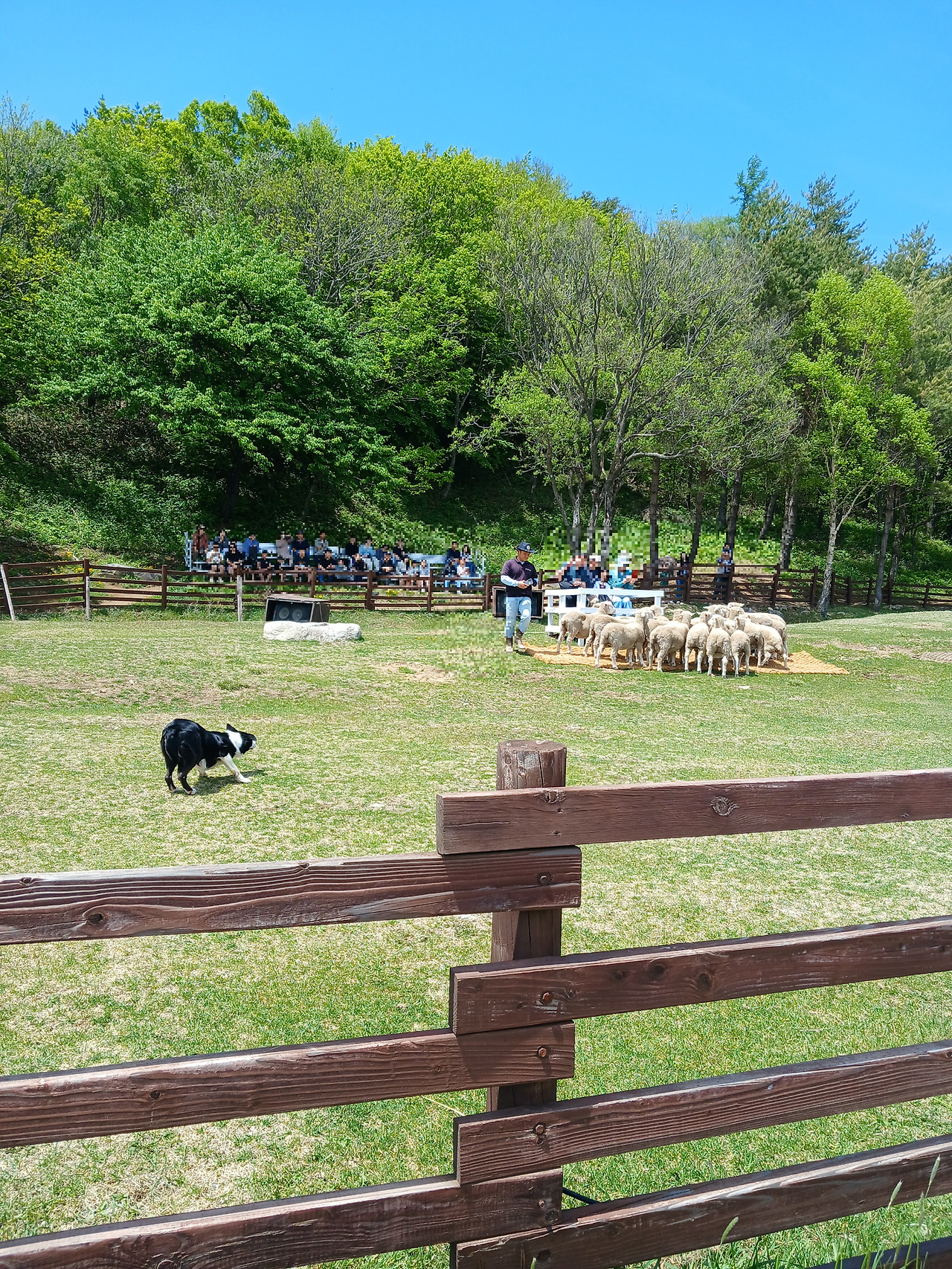 셔틀버스를 타고 가서 중간에 양몰이 개 시연을 봤습니다. 이리 뛰고, 저리 뛰고 하는 강아지가 신호에 맞춰 움직이는 것이 대단하다는 생각을 했습니다. 군견병을 한 입장에서 저런 훈련을 하기 위해 사육사와 강아지가 얼마나 많은 호흡을 맞춰야 하는지 알기에 둘의 유대감이 잘 느껴졌습니다. 양을 꺼내서 풀을 먹인 뒤 다시 울타리 안으로 보내는 것을 늘 영상으로만 봐왔었는데 실제로 보니 무척 신기했습니다.