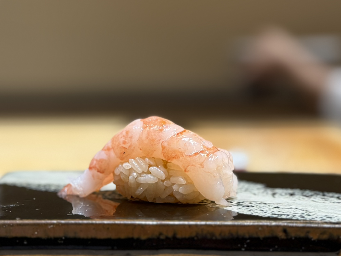 단새우(아마에비)는 살짝 펼쳐 숙성의 단맛을 머금은 채, 샤리 위에 안겼다. 생의 투명함을 간직한 살결에는 찰기가 감돌고, 조심스럽게 씹으면 은은한 단내가 올라왔다. 따뜻한 샤리가 그 단맛을 부드럽게 감싸며, 한 점 안에서 식감과 온도의 균형이 완성된다.