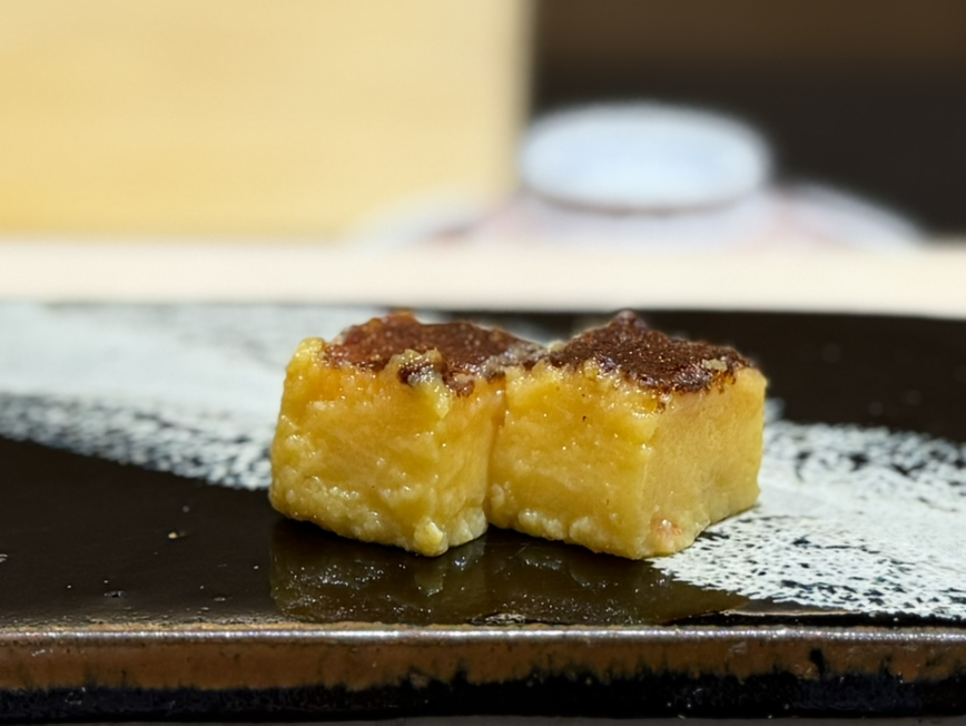스즈메의 교쿠(玉子, 계란말이)는 단맛보다 결의 촘촘함이 먼저 기억된다. 표면은 반들하고 단정하지만, 단단하지 않고 부드럽게 잘린다. 보통의 디저트처럼 설탕의 강한 맛이 앞서지 않고, 오히려 식사의 마지막을 정리하는 ‘미각의 쉼표’처럼 기능한다.