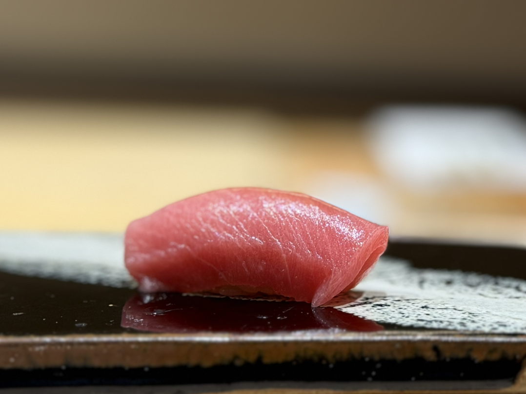 참치 등살을 간장에 절인 즈케 스타일. 표면에 간장의 색이 스며 있고, 안쪽은 붉은 기가 살아 있다. 간장의 풍미는 짧고 또렷하게 스쳐 지나간다.