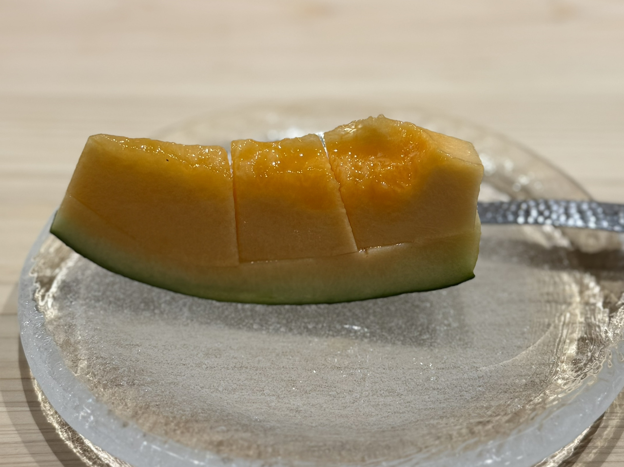이어 등장한 적용멜론(赤肉メロン)은 짙은 오렌지색 과육이 주는 시각적 인상만큼이나 깊고 정결한 단맛을 남긴다. 수분과 당도의 조율이 뛰어나, 입 안을 맑게 정돈하며 전체 식사의 피날레를 맡는다. 디저트마저 밸런스와 여운을 남기는 방식—그것이 스즈메의 식사 구조다.