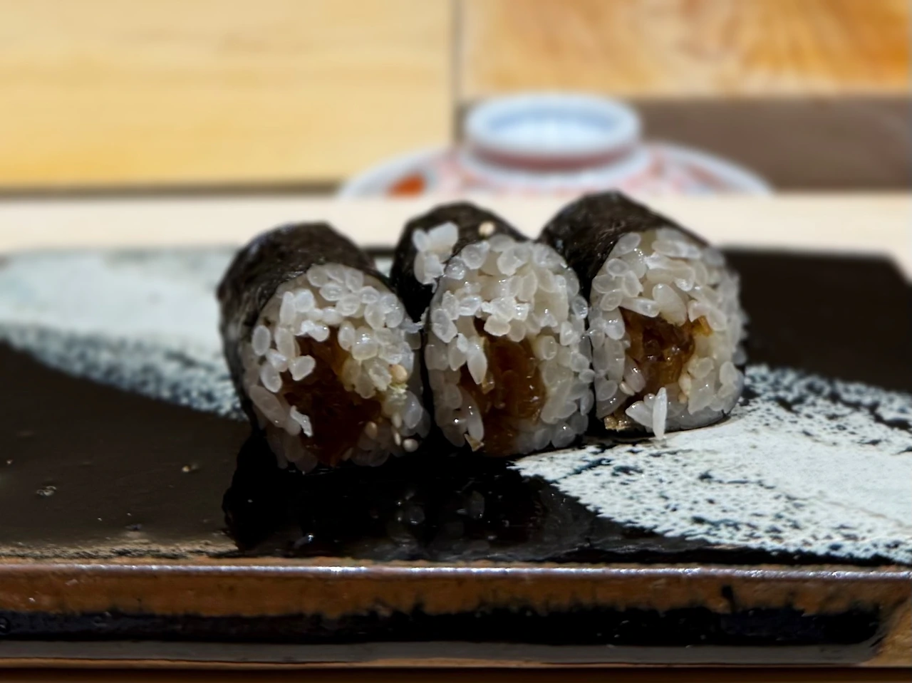 이처럼 스즈메의 스시는 단순히 ‘작게 쥔 밥’이 아니라 ‘구조를 재설계한 초밥’이다. 밥을 줄였다는 사실보다, 밥을 줄인 이유가 중요하다. 셰프는 그 이유를 설명하지 않지만, 그 한 점 한 점은 손의 힘과 방향, 생선의 무게와 감촉, 쥐는 방식과 놓는 온도에 대한 절대적인 숙련을 전제로 한다. 작게 쥐는 초밥은 더 어렵고, 더 정교해야 하며, 동시에 더 책임감 있게 구성되어야 한다. 그래서 이 집의 스시는 작지만 결코 작지 않다.