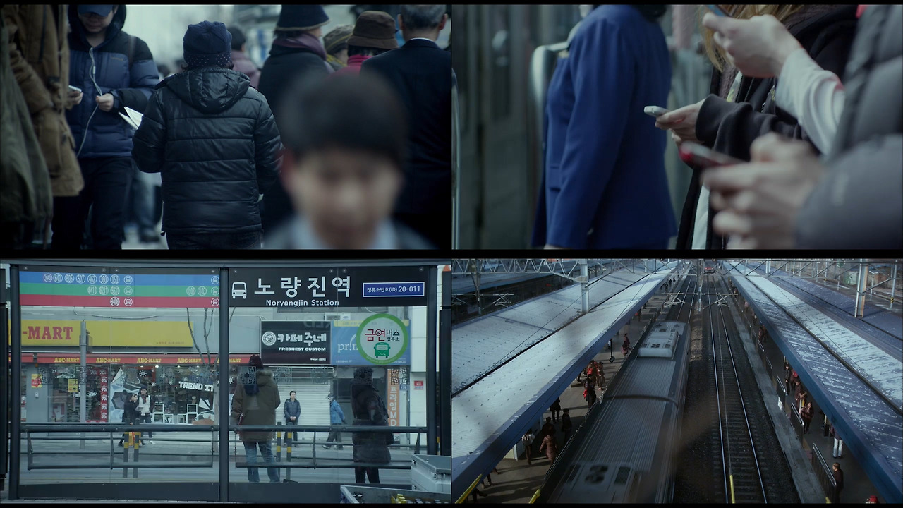 <소셜포비아>는 단순히 악성 댓글을 즐겨 쓰고 인간성을 상실한 채 이기적인 삶을 살아가는 20대 청년들의 단면을 다루는 것처럼 보인다. 그러나 이 영화의 진정한 무서움은 이러한 비도덕적이고 비윤리적인 사람들이 겉으로는 아주 평범하여 구별할 수 없다는 점이다. 영화의 마지막, 지웅의 내레이션과 함께 카메라는 노량진역의 일상을 비춘다([캡처 2]). 포털사이트 실시간 검색어 1위를 차지하던 도더리 현피 사건은 소리 소문 없이 사라진 듯 보인다. 그러나 거리를 거니는 이들 중 누군가는 용민과 현피 멤버들 그리고 인터넷을 통해 현피 사건에 일희일비하던 네티즌들일 것이다. 역 사이를 누비는 사람들의 활기는 어느새 두려움으로 바뀐다. <소셜포비아>가 드러내는 불편함과 불쾌함은 스크린을 넘어 현실로 침입한다.