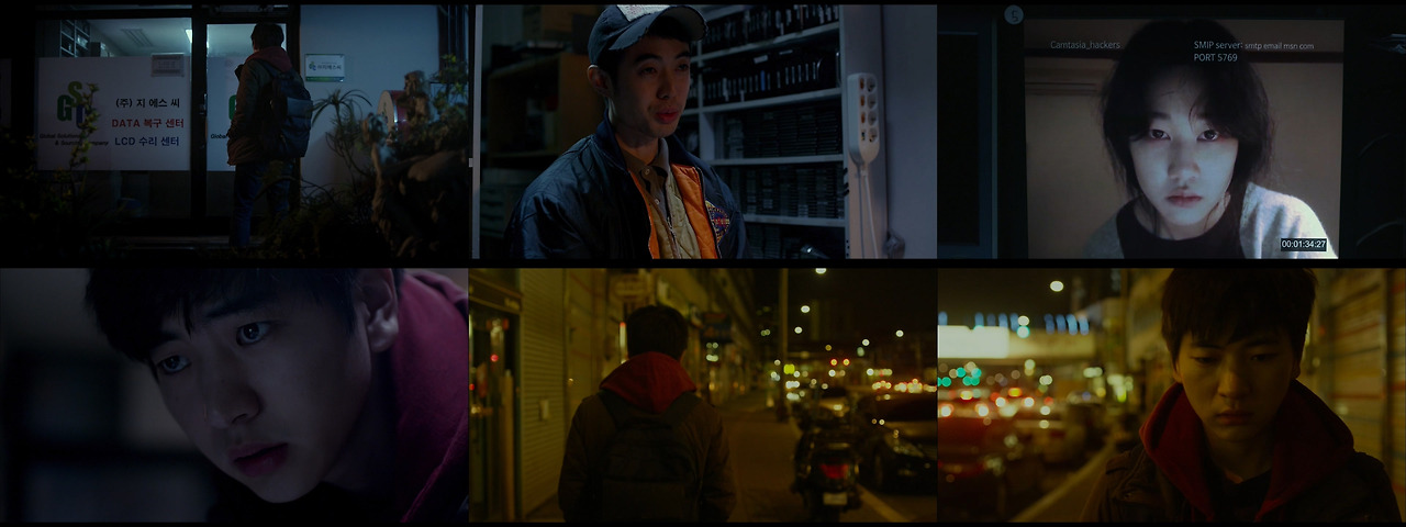 그러나 이는 시작에 불과하다. 영화가 진행될수록 인물들의 이중성은 점점 더 극명하게 드러나게 되고 용민이 자살을 시도하는 클라이맥스를 보며 느끼는 불편함은 이윽고 불쾌함으로 뒤바뀐다. 용민이 ‘도더리’라는 사실에 배신감을 느낀 현피 멤버들은 목을 매어 자살을 시도하는 용민을 둘러싸고 그의 면전에 조롱과 비웃음을 일삼는다. 불쾌함의 극치. 그러나 이윽고 떠오르는 의문. ‘이 불쾌함의 근원은 현피 멤버들에게만 있는 것인가?’ 영화의 클라이맥스가 등장하기 이전, 영화 내내 카메라는 주인공인 지웅을 따라다닌다. 노량진 학원, 하영의 집, 경찰서, 카페, 하영이 다녔던 천강대학교 등 영화에 등장하는 거의 모든 장소에는 지웅이 있다. 다른 인물들을 바라보더라도 그 장소에는 항상 지웅이 있다. 그러나 처음으로 지웅이 없는 상태에서 카메라는 다른 인물을 따라가는데 그는 바로 용민이다([캡처 1]). 용민은 온라인상에서 ‘안개 속의 미해결 사건’ 카페를 운영하고 오프라인에서는 조그마한 컴퓨터 수리 복구 업체를 운영하는 오형주를 찾아간다. 용민은 형주가 하영을 죽인 범인이라 생각했지만 용민은 그곳에서 뜻밖의 영상을 접한다. 하영의 노트북을 해킹하여 얻어낸 하영이 죽기 직전의 영상. BJ 양게의 인터넷 방송을 보고 있는 하영은 자신의 집으로 찾아오는 현피 인원들을 보고 당혹감을 감추지 못한다. 그녀의 표정에는 자신의 정체가 들킬 거라는 불안감과 더불어 공포감이 서려있다. 오형주의 말대로 하영은 자살한 것 같다. 현피 인원들이 복도까지 온 상황에서 그 사이에 누군가 하영의 집에 침입해 살인을 하고 도망간다는 것은 사실상 불가능에 가까운 일이다. 이를 양게와 병무, 장세민이 검증했을 때 약 10분이라는 시간이 소요되지 않았는가. 이후 카메라는 길을 나서는 용민을 따라간다. 무언가를 생각하는 듯 알 수 없는 표정을 짓는 용민을 바라보는 카메라. 용민은 정말 하영의 죽음에 죄책감을 느껴 자살을 시도한 것일까?