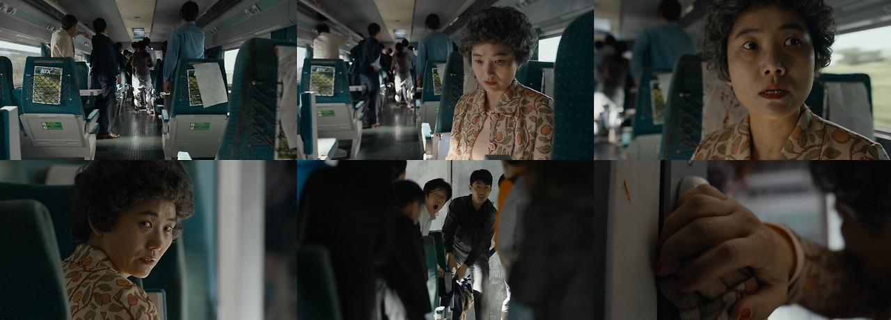 물론, 그럴 수 있다. 자신의 목숨도 담보할 수 없는 상황에서 어찌 모르는 사람의 생사까지 신경 쓸 수 있을까. 이후 석우 일행이 출입문을 뚫기 위해 나머지 생존자들과 사투를 벌이는 씬(scene)에서 종길은 인길이 아직 살아 있음에 놀라고 뒤이어 인길이 좀비에게 물리는 장면을 보고는 더더욱 놀란다. 그리고 석우 일행이 다른 칸으로 이동한 후 그들이 들어오지 못하게끔 나머지 생존자들이 반대편 출입문을 막는 사이 카메라는 또다시 조용히 그들에게 벗어나 트랙 아웃하여 종길을 바라본다. 종길은 ‘왜 자기 살 궁리는 안 하고 다 퍼주기만 하고 힘들게 살았냐’며 좀비가 되어버린 인길을 향해 나무란다. 종길이 뒤를 바라보자 카메라는 서글픈 음악과 더불어 출입문을 막기 위해 안간힘을 쓰는 사람들을 슬로우 모션을 통해 보여준다([캡처 2]). 그리고 종길이 던지는 한마디. “놀고 있네.” 이전 [캡처 1]의 장면과 동일하게 짜인 [캡처 2]의 구도는 종길의 불쾌하기 짝이 없는 서사를 진행시키기 위한 수단으로 명백히 기능한다. 즉, 종길은 인길을 구하지 못했다는 죄책감에 자살하기 위해 출입문을 여는 것이 아니라 사람들을 죽이기 위해 출입문을 연다.