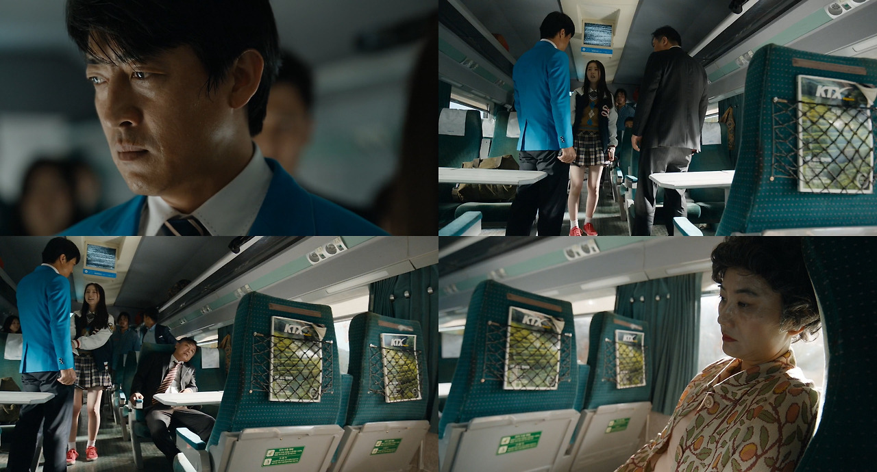 이전 장면으로 되돌아가 보자. 나머지 생존자들과 함께 있는 진희는 영국의 문자메시지를 통해 석우 일행이 살아있음을 깨닫고 석우 일행을 구해야 한다며 사람들을 설득하기 위해 애쓴다. 그러나 용석은 석우 일행이 감염되었는지 아닌지 어떻게 아냐며 거세게 호통 친다. 용석의 외침에 대한 사람들의 무언의 긍정 속에서 카메라는 조용히 그들에게 벗어나 우측으로 패닝 하여 종길을 바라본다([캡처 1]). 종길은 진희의 간절한 하소연은 외면한 채 멍한 표정을 짓고 있다. 종길은 이미 인길이 죽었다고 생각하고 있는 중이다. 만약 그렇지 않았다면 종길은 진희에게 다가가 석우 일행 중에 할머니는 없냐며 영국에게 연락해보라고 시켰을 것이다. 종길은 인길의 죽음 이외에 나머지 사람들의 생사는 전혀 관심이 없다.