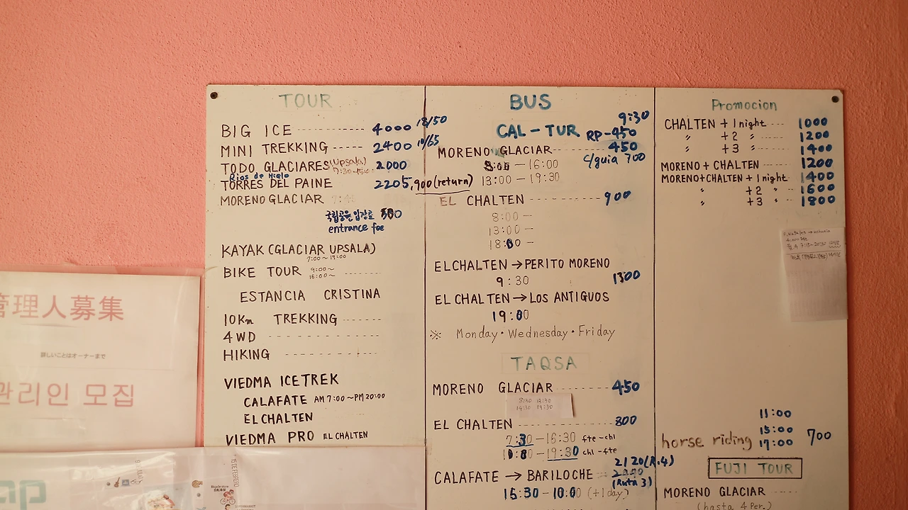 빠른 걸음으로 버스 터미널에 도착하니, 투어 버스가 떠나기 20분 전이었다. 터미널에는 여행사 부스가 여러 개 모여 있었는데, 빙하 투어 말고도 낚시 투어라든가 캠핑 투어라든가 다른 투어 상품들이 많았다. 투어 회사를 고르고 말고 할 것 없이, 모레노 빙하 투어라는 현수막이 걸린 곳으로 곧장 걸어갔다.