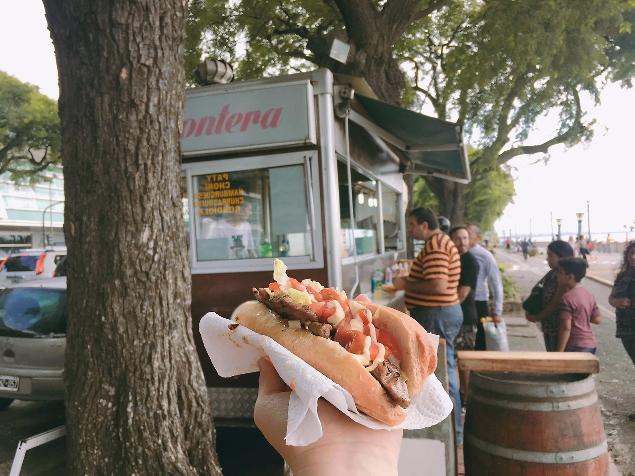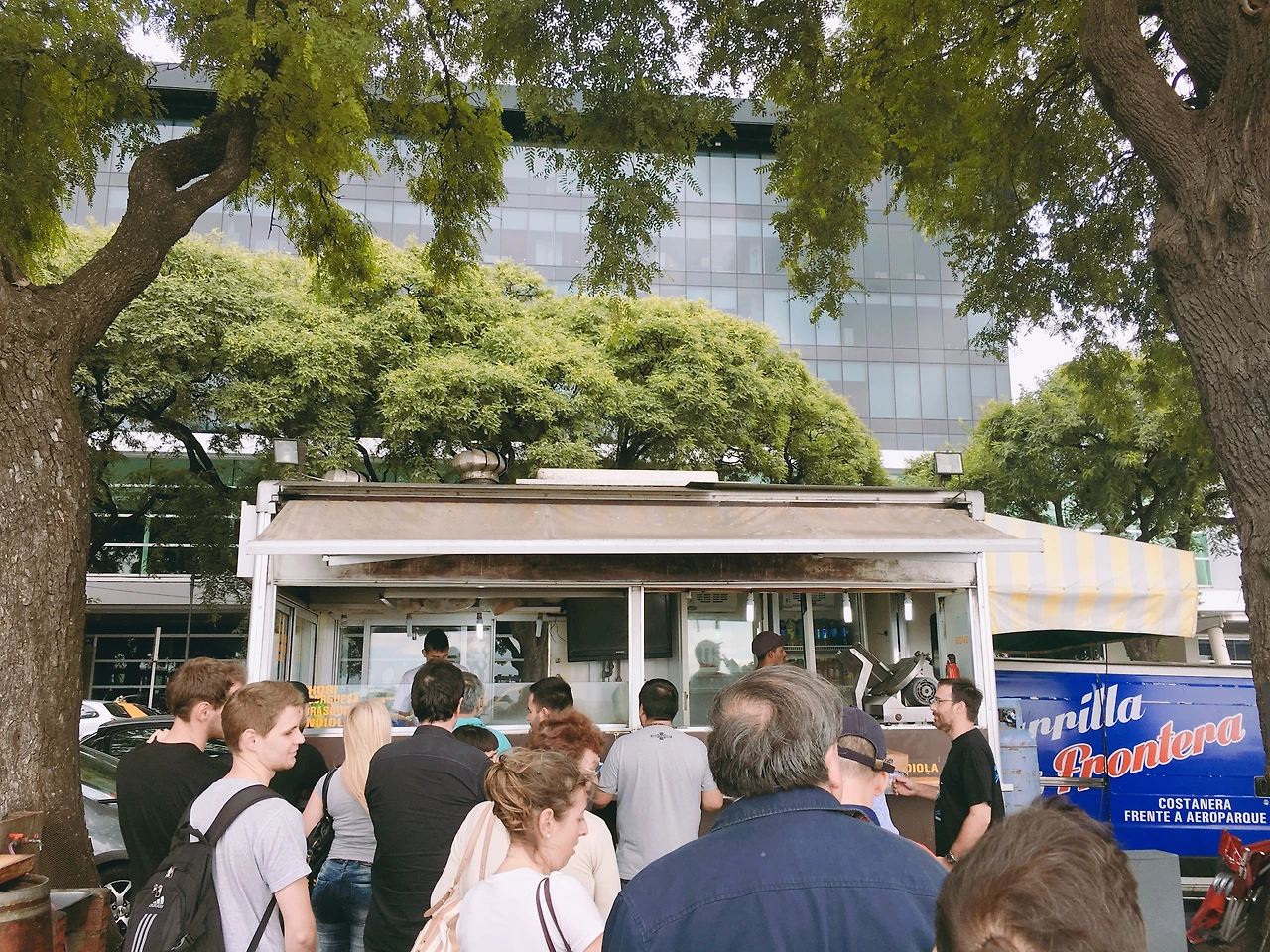 다시 부에노스아이레스로 돌아왔다. 공항 밖 풍경은 여전히 멋졌다. 건물만큼 큰 높이의 가로수들, 그 가로수들 틈새로 보이는 바다, 해안을 따라 늘어선 산책로와 그곳에 있는 간이음식점... 창밖으로 내다보며 입맛만 다시다 눈이 마주친 우리는 동시에 외쳤다.