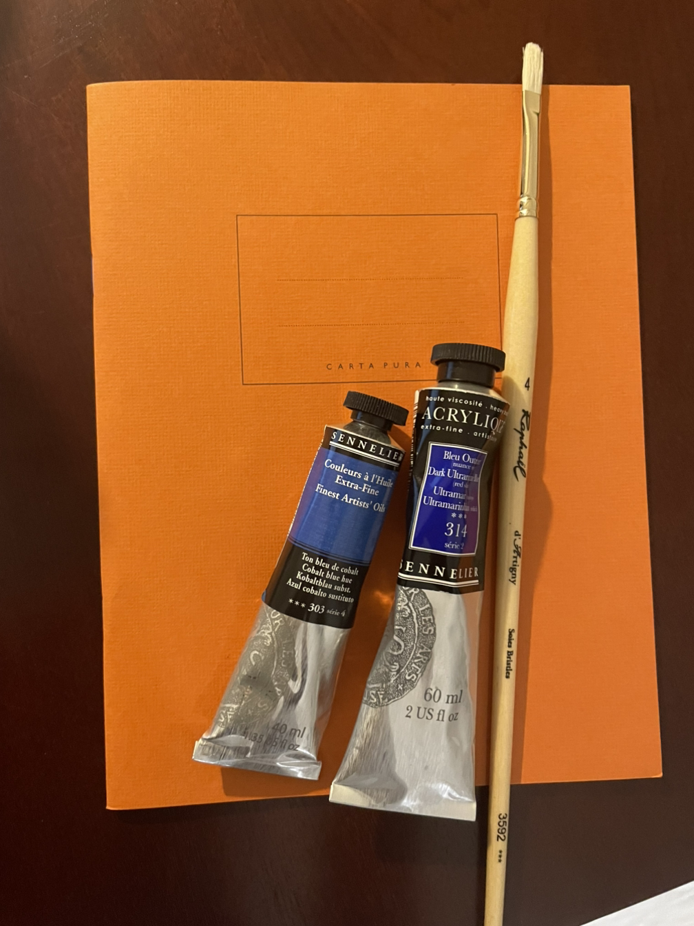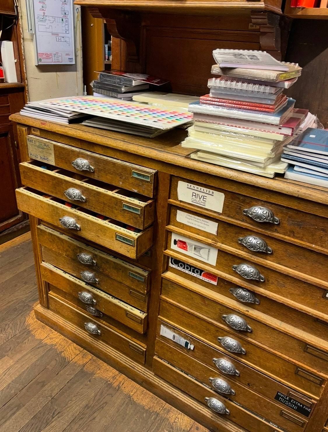 기념이 될 만한 물감과 붓을 사고 싶었다. 2025년의 직원들은 친절했고 설명을 잘해주어 고마웠다. 울트라 마린 블루 색상의 아크릴 물감은 찾았는데 유화 물감은 보이지 않아서 직원에게 물었더니 자신을 따라오라며 카운터 근처의 큰 서랍장 앞에 가서 서랍을 열어 보여주었다. 서랍장 안에는 칸칸마다 다른 색깔의 유화물감이 들어 있었다. 여건이 된다면 그곳의 물감을 하나씩 색깔별로 사고 싶었지만 나는 파리를 곧 떠나야 하는 여행자이니, 그 물감들을 다 살 형편이 안되었다. 게다가 유화 물감은 낱개 하나에도 너무 비싼 가격이어서 결국 유화 물감은 코발트블루 hue를 샀다. 그걸 산 이유도 계산서를 보고 놀라는 내게, 직원이 유화 물감은 hue를 사라고 권유해 준 덕분이었다. 차분하고 다정한 직원 덕분에 물감 두 개와 붓 한 자루, 얇고 쓰기 아깝게 생긴 노트를 시넬리에 화방에서 샀고 한국에 가져왔다.