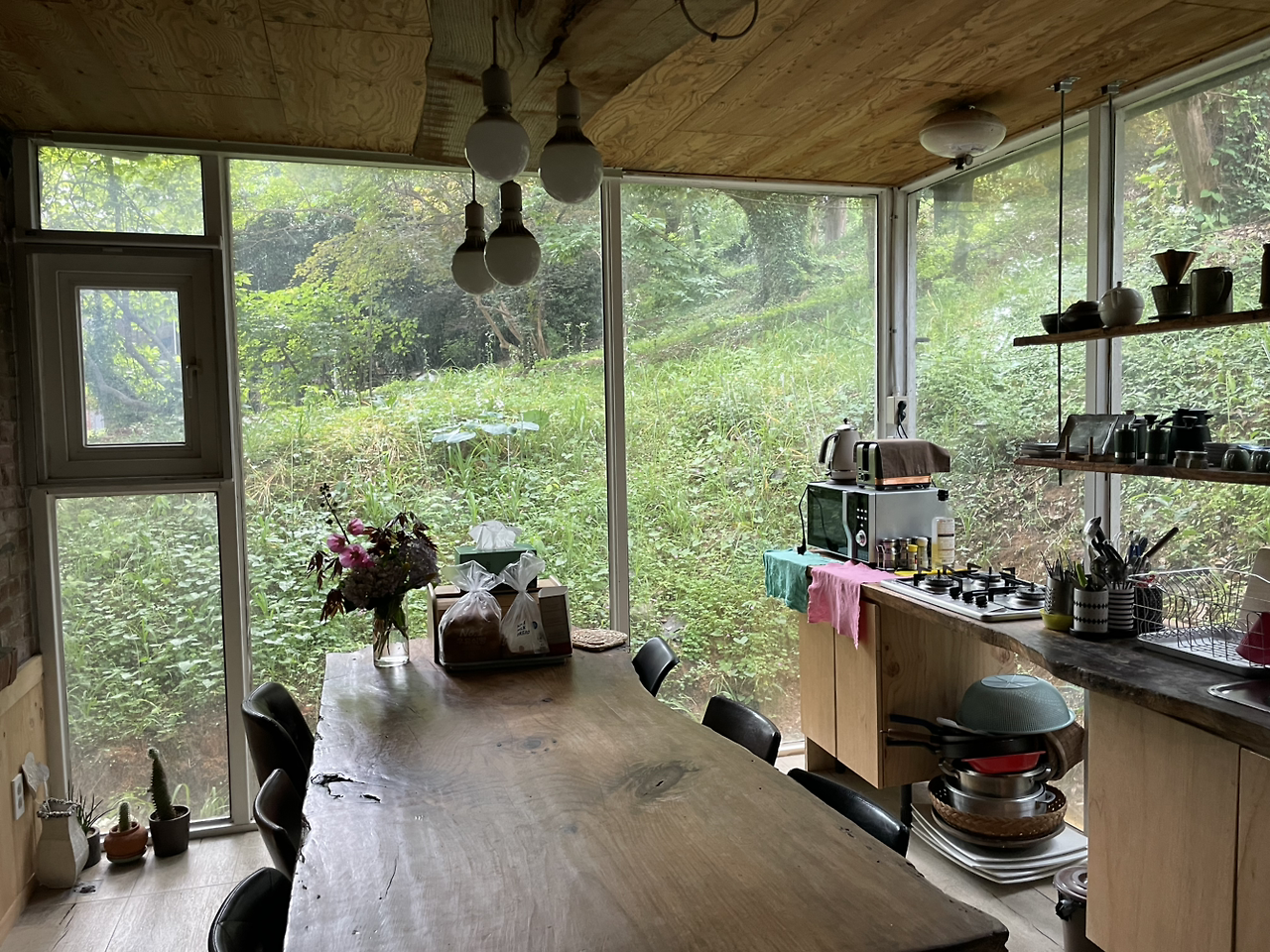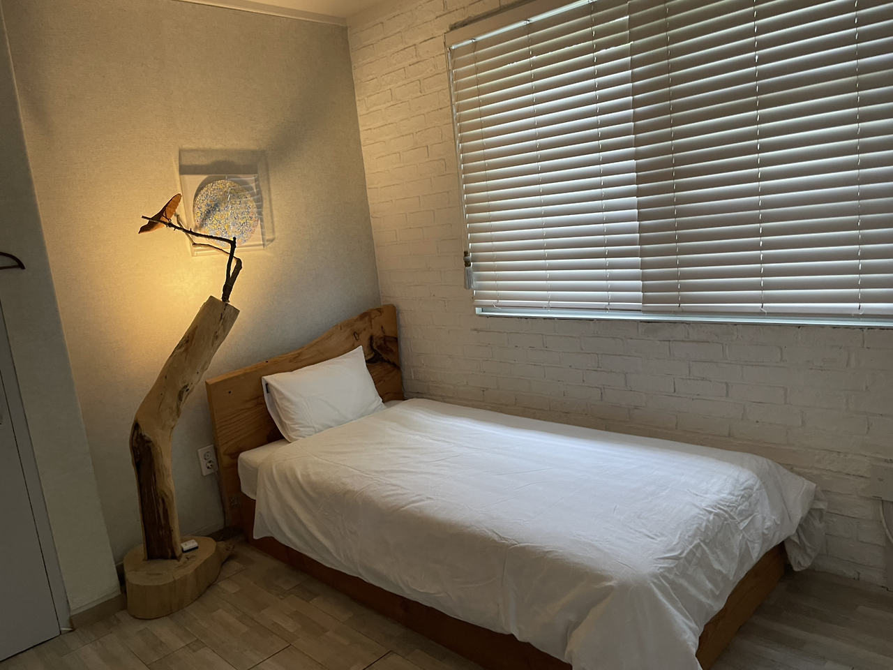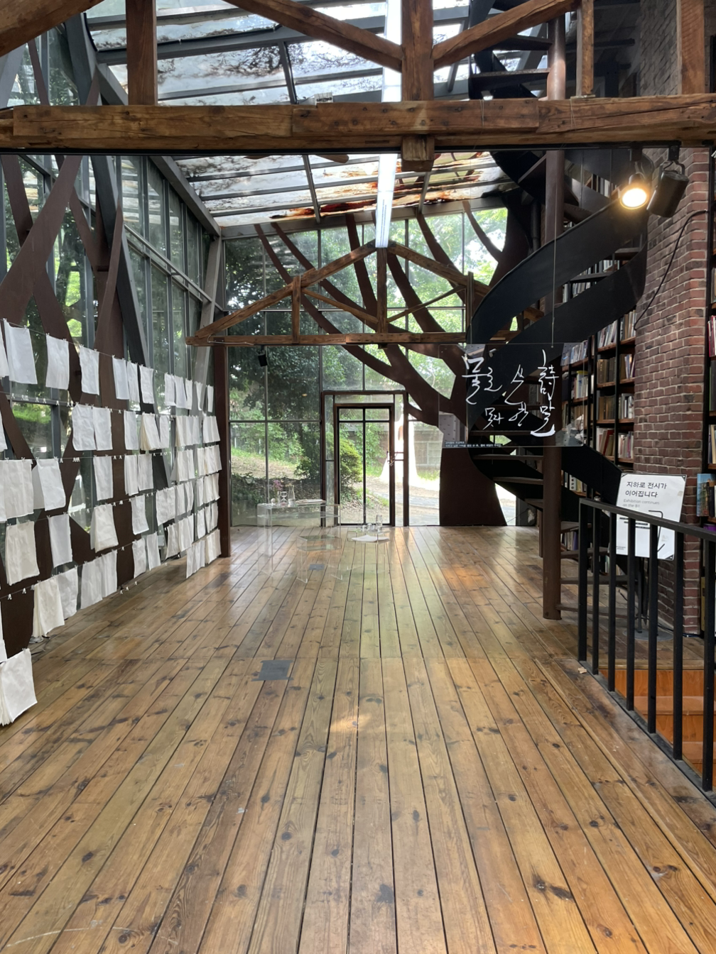 호랑가시나무언덕 게스트하우스까지 가는 길이 참 정겨웠다. 인쇄소 골목을 지나 작은 천변을 건너 예전 선교사들이 살던 마을로 이어지는 길은 여러 골목으로 연결되어 있었고 이제는 사람들이 많이 사는 지역은 아닌 것 같았지만 카페나 음식점, 갤러리들이 곳곳에 보였다. 언덕을 올라 숙소에 도착했고, 미리 전달받은 비번을 누르고 안으로 들어갔다. 오래되어 낡은 서양식 건물이었고 건물 내부의 인테리어나 구조는 어린 시절 살았던 주택을 떠올리게 했다. 나는 2층의 ‘서서평방’을 예약했다. 2층엔 방이 2개였는데 내가 묵은 방이 아닌 나머지 방에서 전 문재인 대통령 부부가 숙박했다는 내용의 블로그를 읽은 적이 있다. 욕실은 공용이고, 거실과 베란다가 있는 전형적인 가정집 구조로 실제로 선교사들이 살았던 곳이라고 한다. 베란다 쪽으로 난 큰 통창으로 바깥의 수풀이 한가득 보여 싱그러웠다. 아래층 공용 주방에서도 마찬가지였다. 숙소의 위치나 분위기는 완벽했는데 하나 아쉬운 점은 숙소의 청결도였다. 어린 시절 엄마가 며칠 청소를 안 한 집에 간 기분이랄까. ‘다 좋을 순 없구나.’ 싶었다. 방에서 조금 쉬다가 숙소 주변을 돌아보았다. 호랑가시나무언덕 주변의 산책길을 걷고, 선교사들의 집도 구경했다.