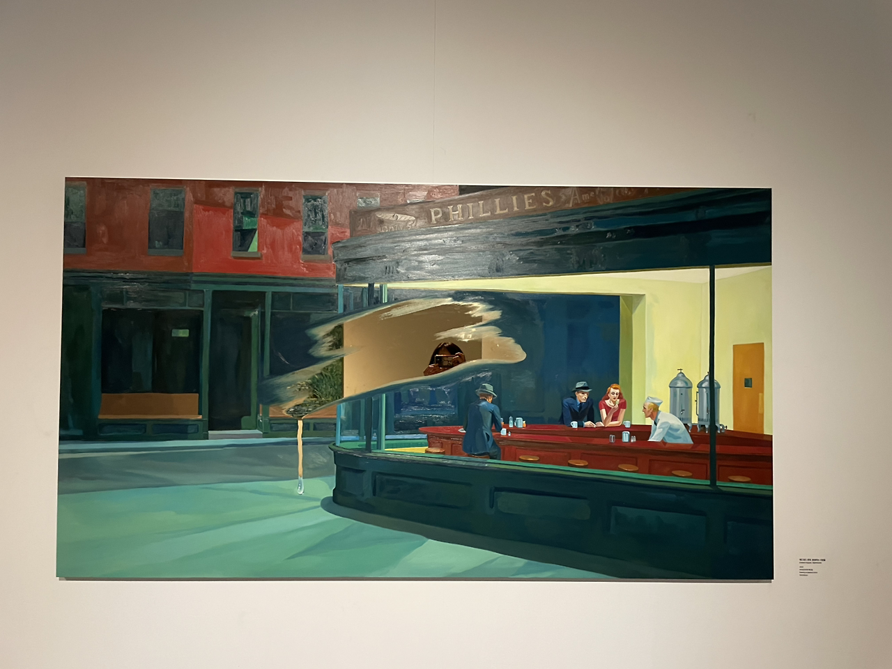 에드워드 호퍼의 ‘밤을 새는 사람들’을 미디어아트로 만든 작품에 끌렸는데 이 작품을 몇 년 전 부산 벡스코 아트페어에서 본 기억을 떠올렸다. 2차원의 그림에 영상을 부여해 생생한 현장감이 느껴지고 무표정한 사람들의 표정이 스며들다 사라지는 영상 기법은 매력적이었다. 마치 큰 티비 화면 속에 그림이 꽉 채워서 들어가 움직이고 있는 것처럼, 사람들이 밤을 새우며 이야기를 나누는 것처럼 보였다.
