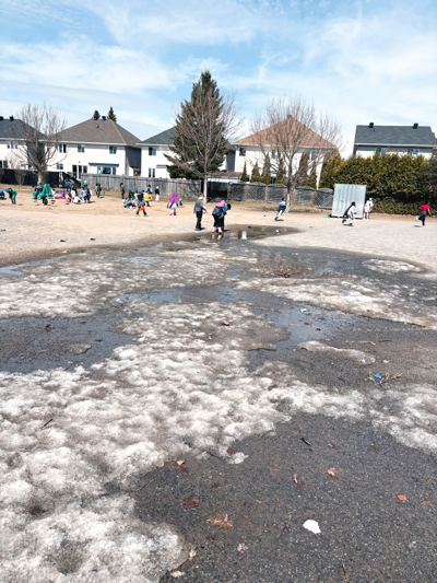 4월 둘째 주, 눈이 거의 다 녹아갈 무렵 며칠간 봄비가 보슬보슬 내리더니 킨더 놀이터 곳곳에는 작은 웅덩이들이 자리를 잡았다.