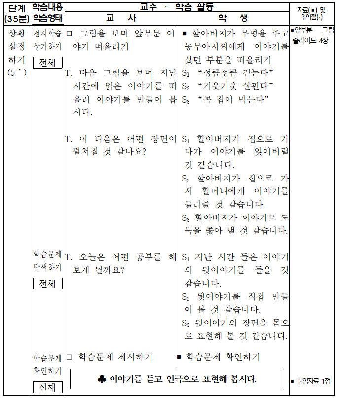 도입에서 힌트를 얻어 학습 문제를 학생들이 직접 말하든, 주 학습 계획안에 안내되어 주제를 미리 다 알고 있든, 교과서를 펴고 있어서 보고 말하든 그것은 중요하지 않다.