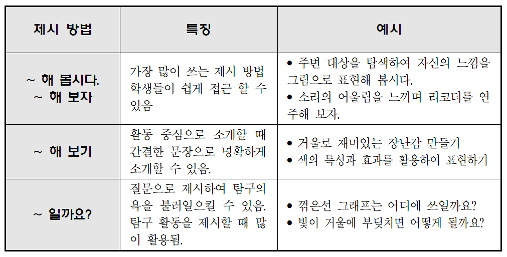 학습문제는 대부분의 교사가 "~해 봅시다." 또는 "~해 보자"로 제시한다. 가장 많이 쓰고 있는 제시법이다. 학생들이 편하게 접근할 수 있는 제시법이다. 그리고 "~하기", "~일까요?"로 제시할 수도 있다.